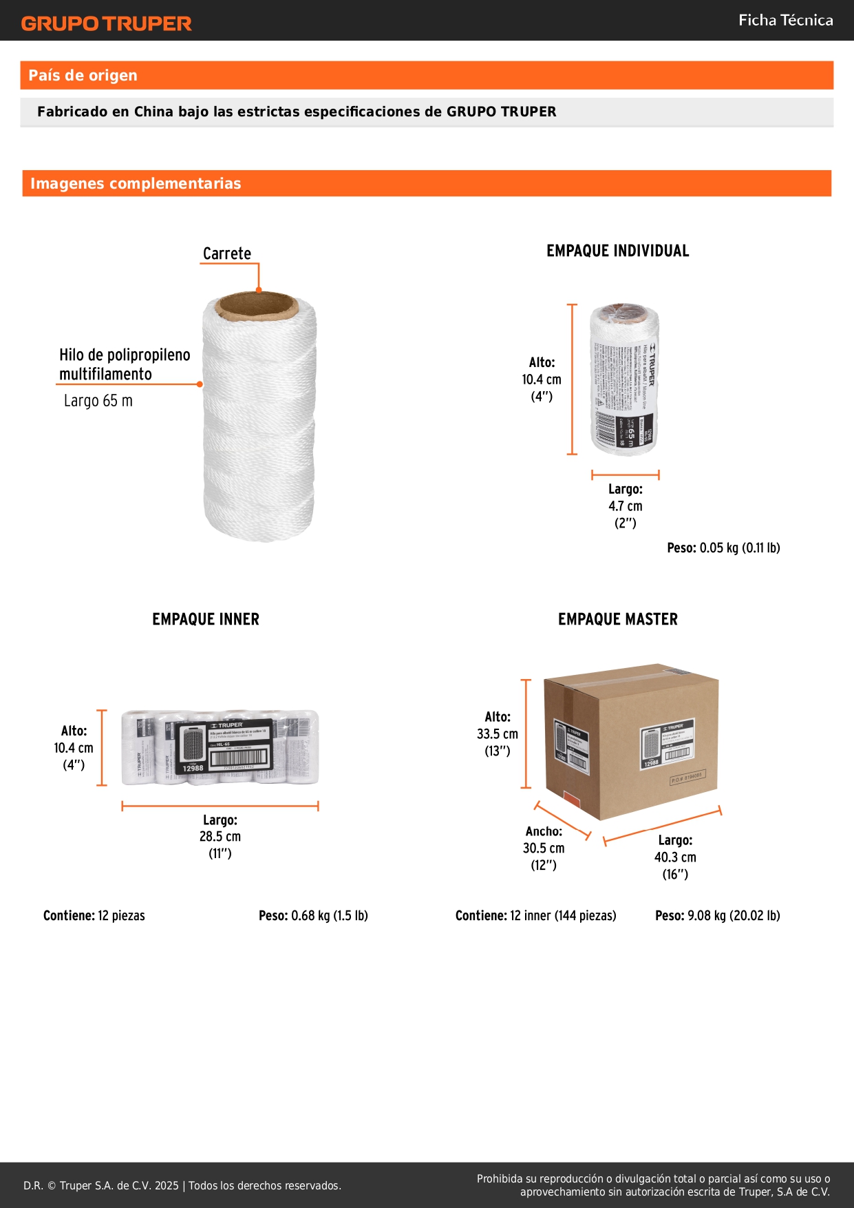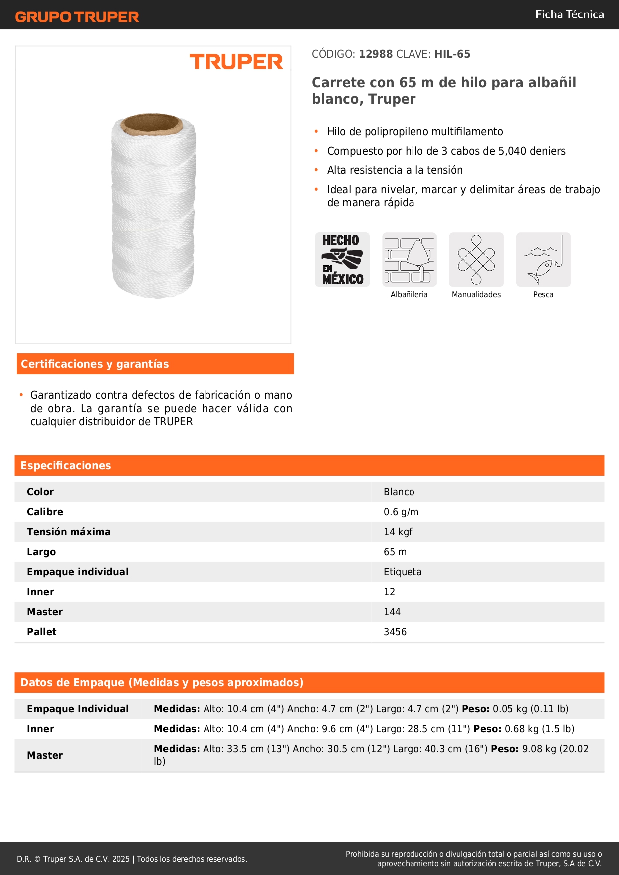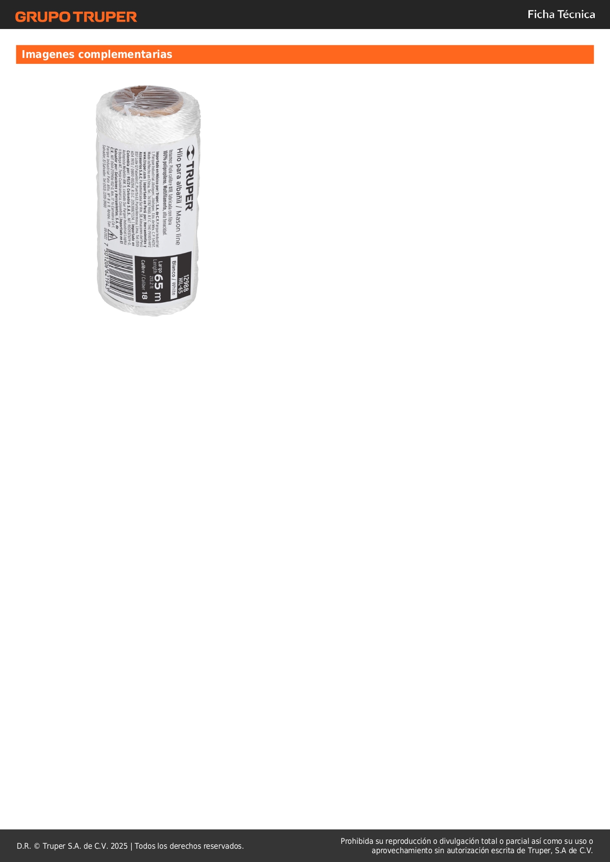 Carrete con 65 m de hilo para albañil blanco, truper S/ 3.30 Agregar al carro Avísame cuando llegue -Hilo de polipropileno multifilamento-Compuesto por hilo de 3 cabos de 5,040 deniers-Alta resistencia a la tensión-Ideal para nivelar, marcar y delimitar áreas de trabajo de manera rápida