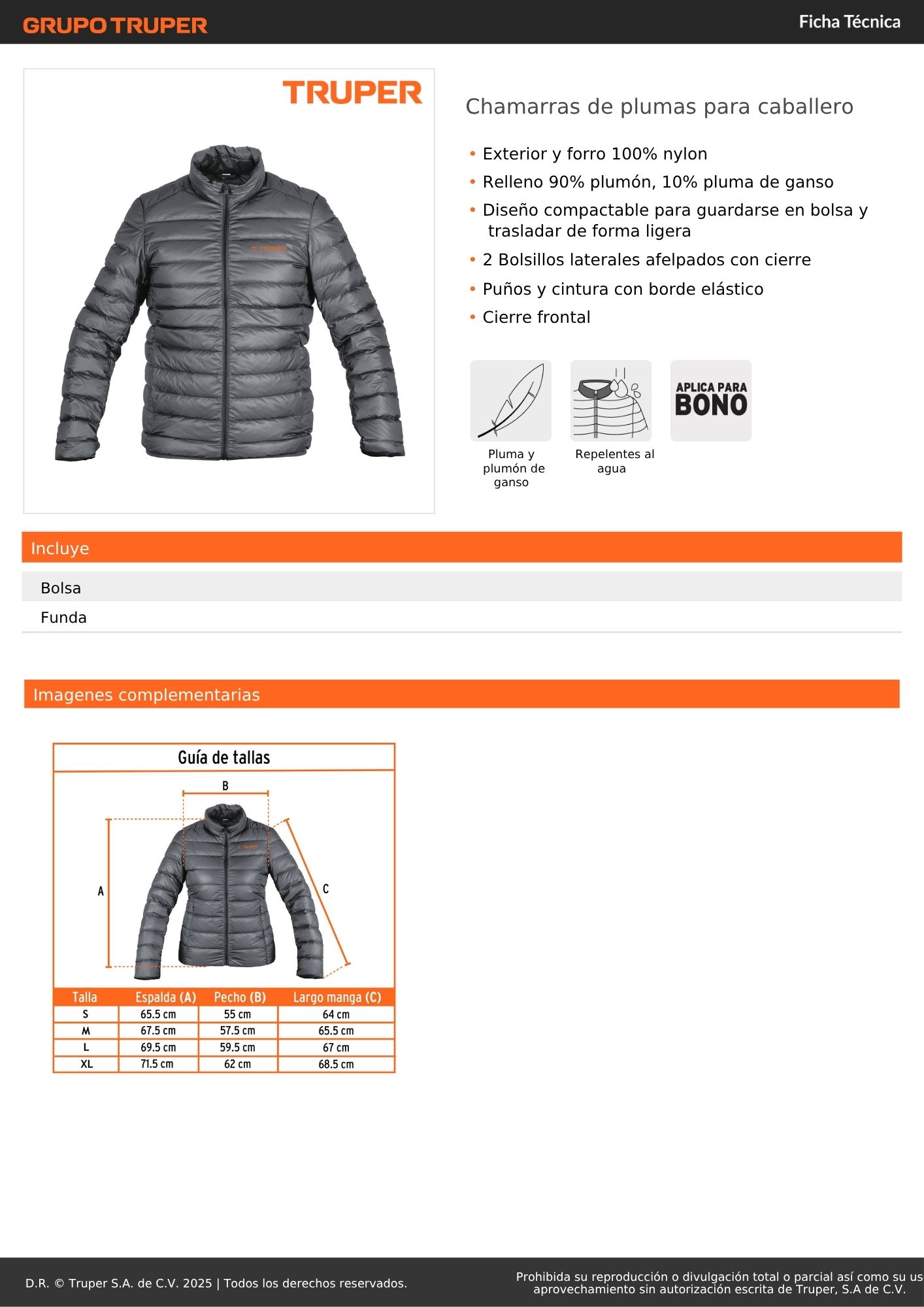 Casaca de plumas para caballero, truper