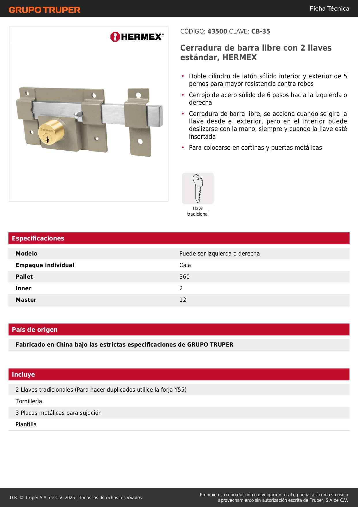 Cerradura de barra libre con 2 llaves estándar, Hermex