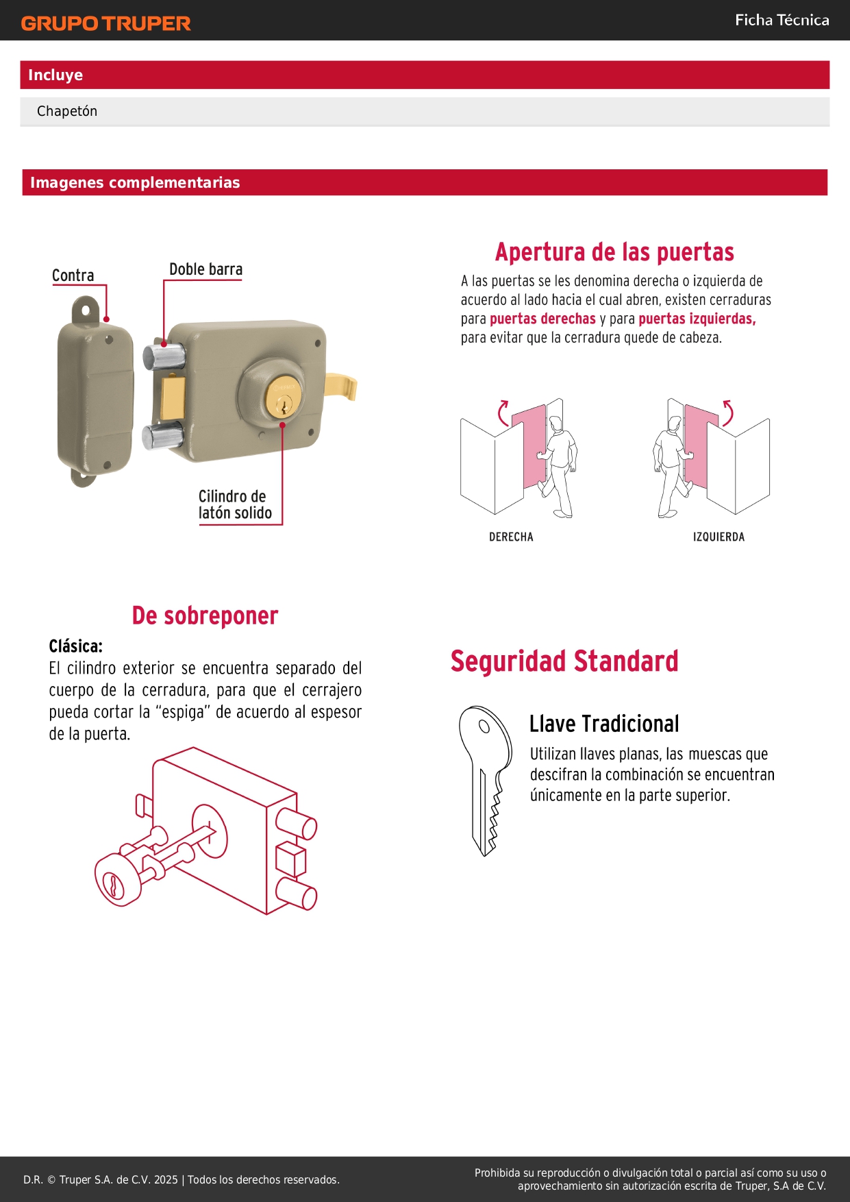 • Para colocación en puertas metálicas o de madera con espesor hasta de 2" (50 mm)