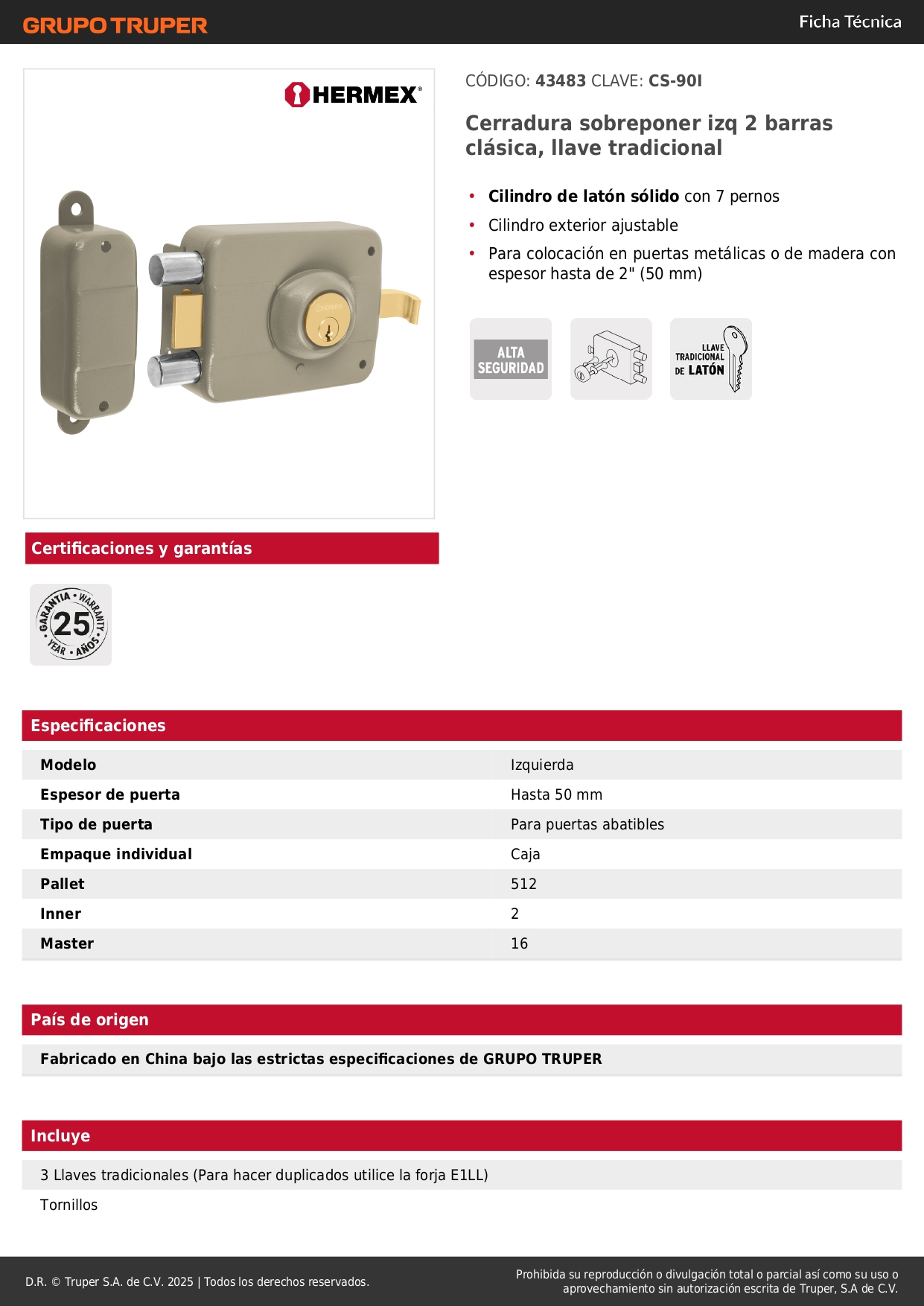 Chapa cerradura de sobreponer izquierda alta seguridad hermex