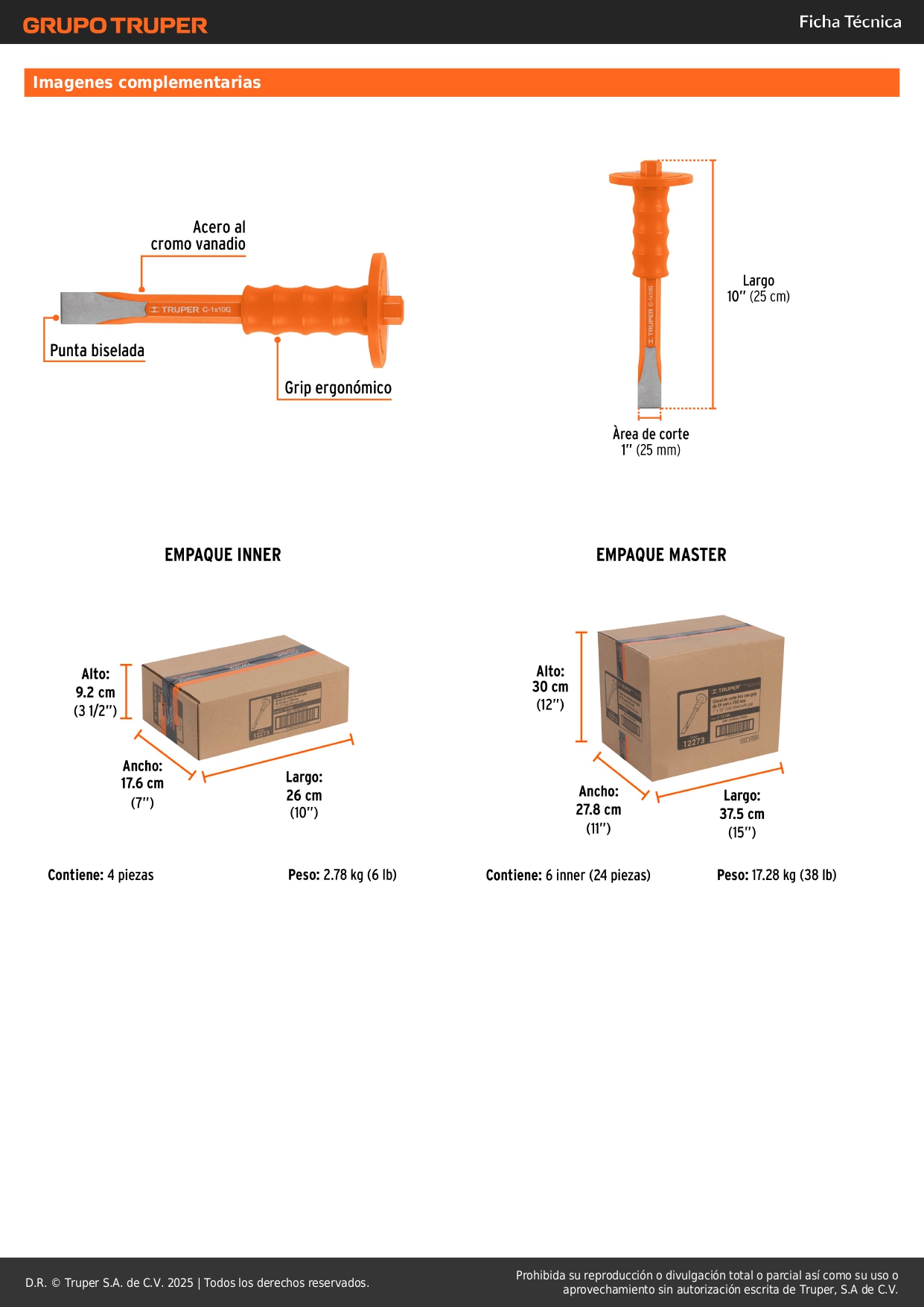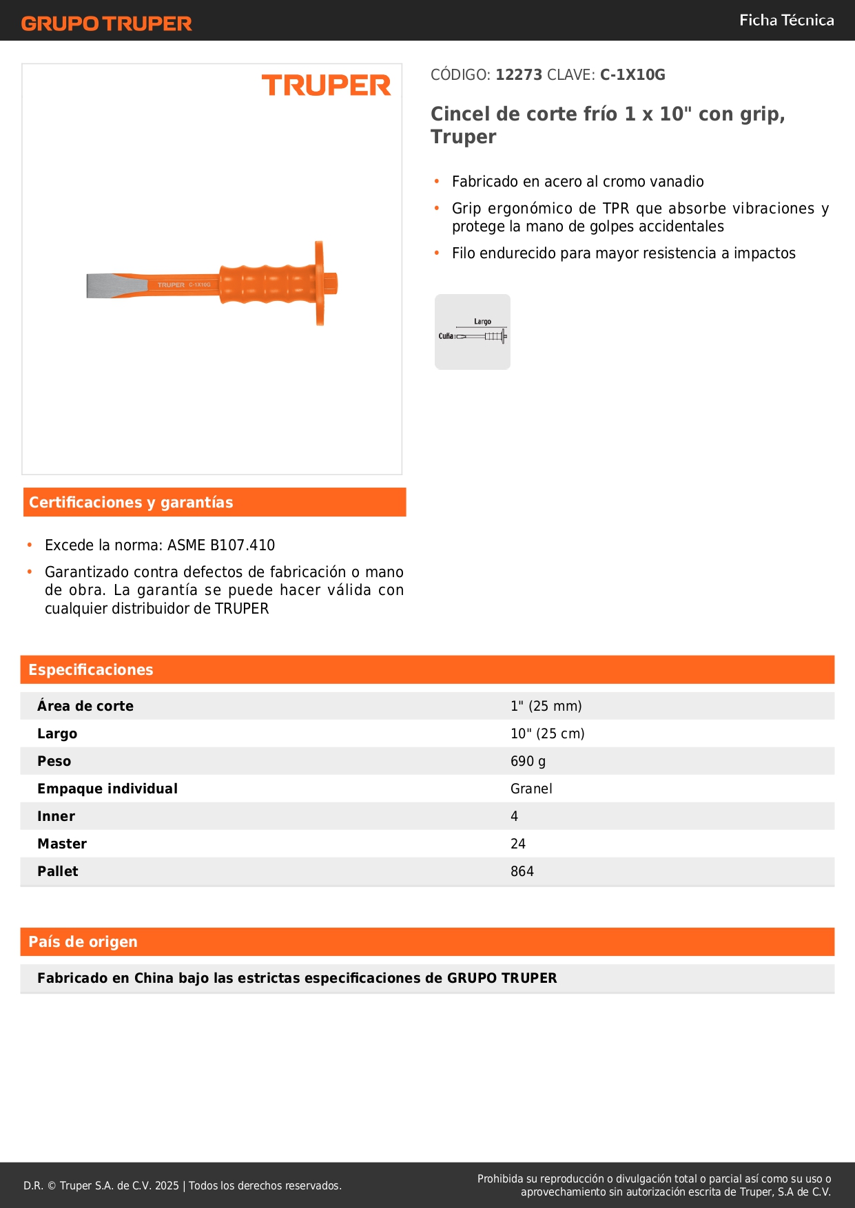 Cincel de corte frío 1 x 10'' con grip. truper S/ 25.90 Agregar al carro Avísame cuando llegue -Fabricado en acero al cromo vanadio-Grip ergonómico de TPR que absorbe vibraciones y protege la mano de golpes accidentales -Filo endurecido para mayor resistencia a impactos