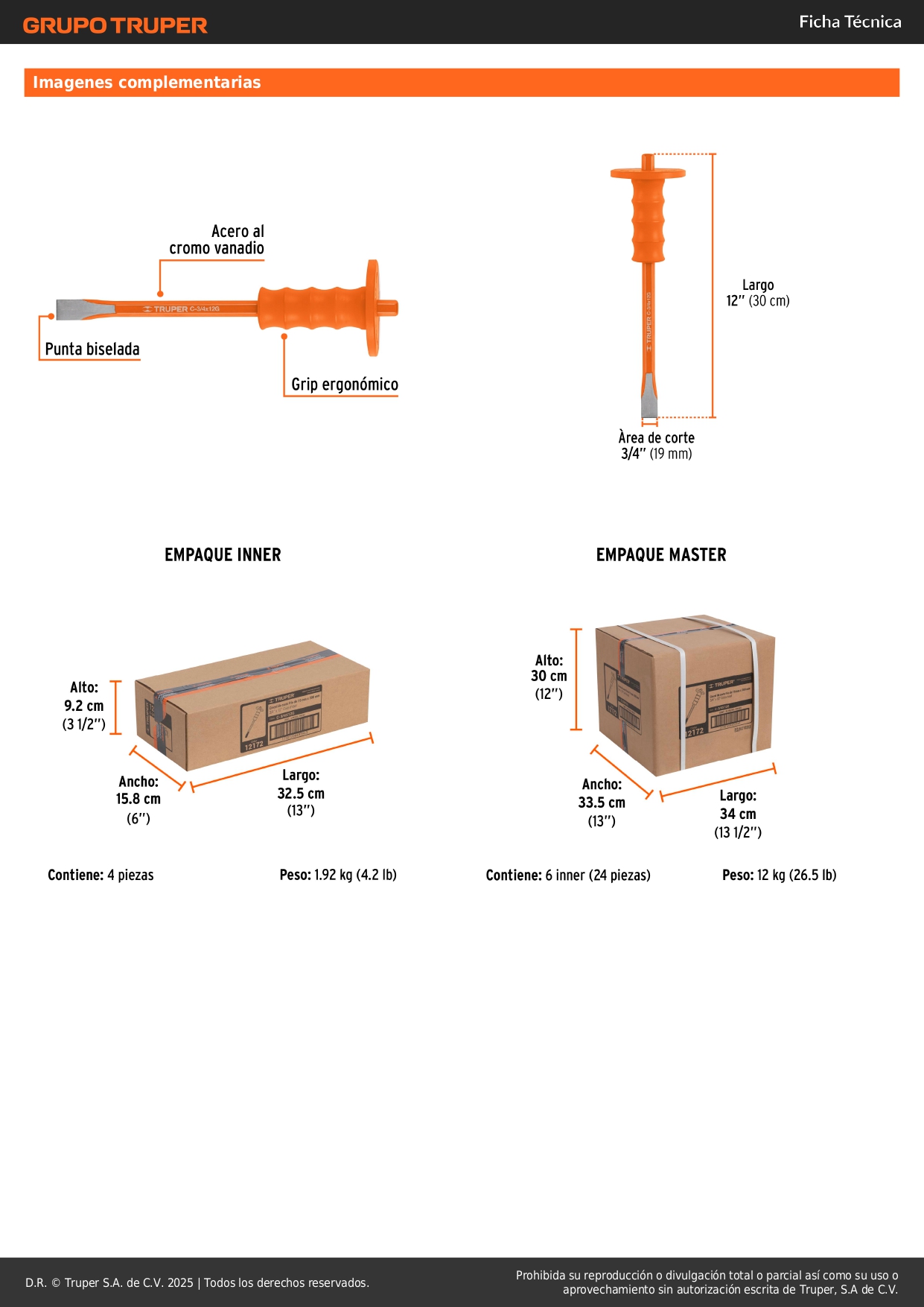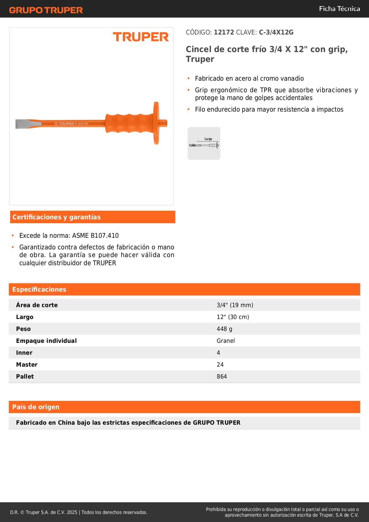 Cincel de corte frío 3/4 x 12'' con grip truper S/ 19.50 Agregar al carro Avísame cuando llegue -Fabricado en acero al cromo vanadio-Grip ergonómico de TPR que absorbe vibraciones y protege la mano de golpes accidentales -Filo endurecido para mayor resistencia a impactos