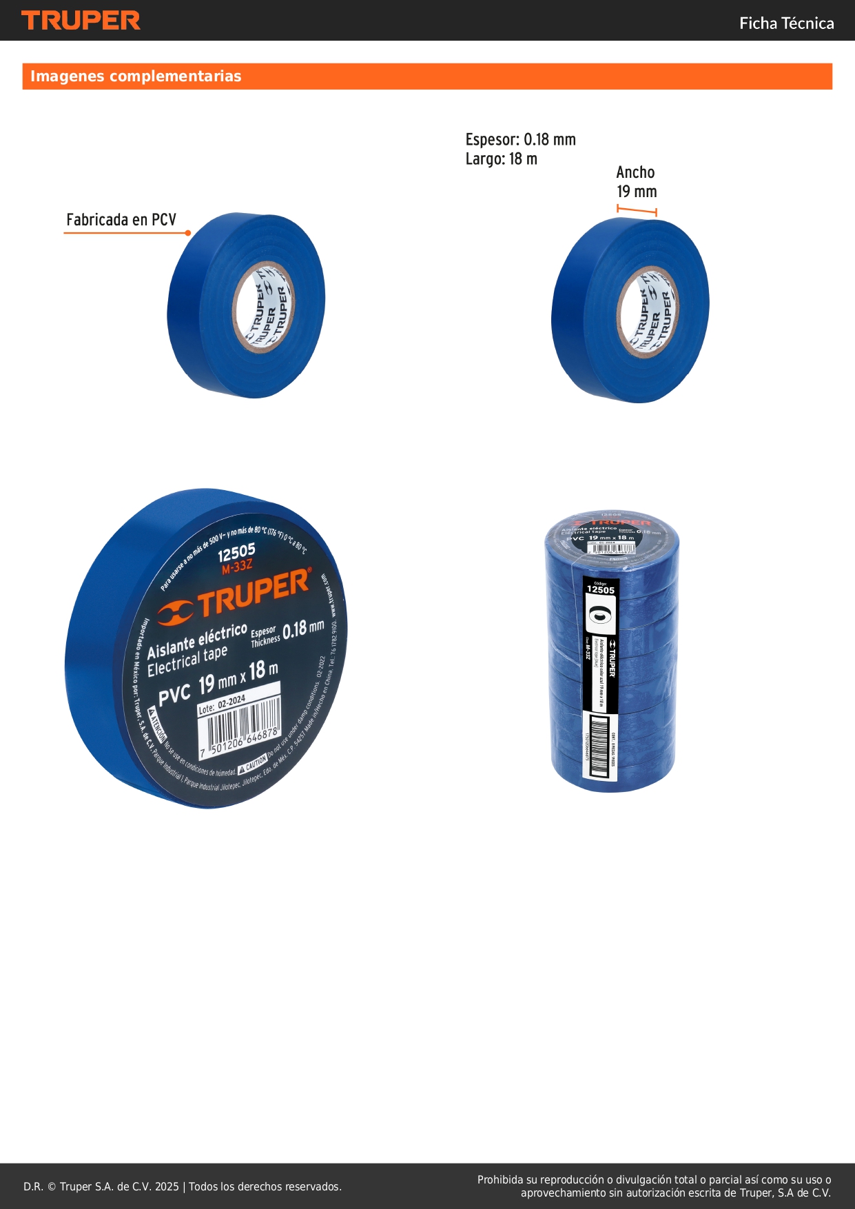 Cinta aislante de 18 m x 19 mm, azul, truper S/ 3.50 Agregar al carro Avísame cuando llegue -Cinta de PVC-Base de adhesivo hule - resina para mayor adherencia en temperaturas frías y de calor (0 °C a 80 °C)-Retardante de flama y excelente flexibilidad