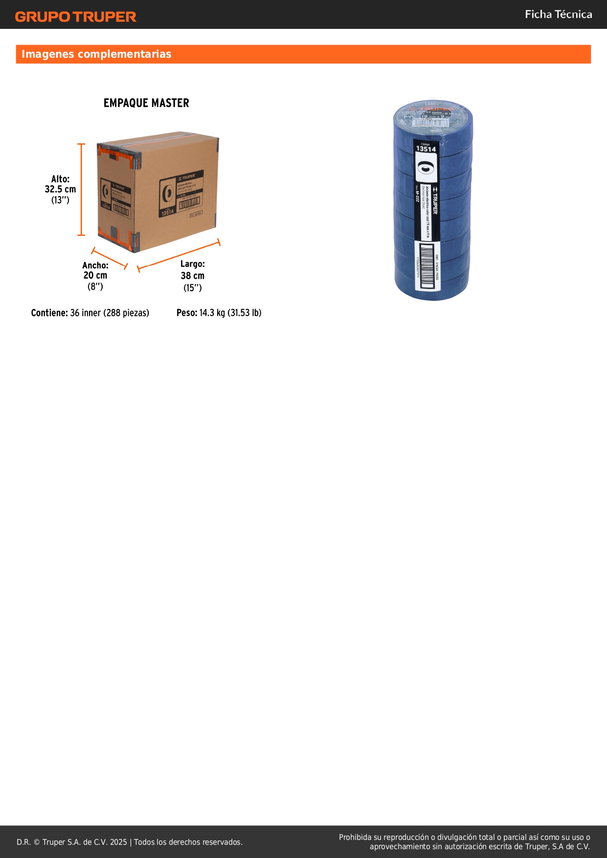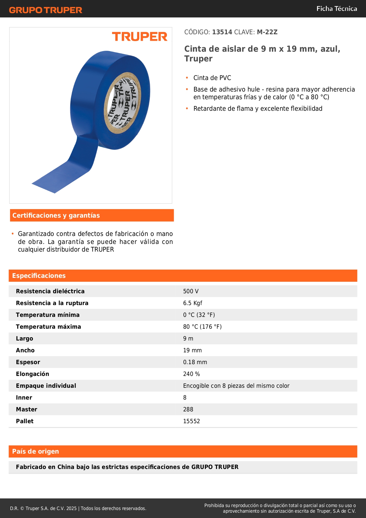 Cinta aislante de 9 m x 19 mm, azul, truper S/ 1.60 Agregar al carro Avísame cuando llegue -Cinta de PVC-Base de adhesivo hule - resina para mayor adherencia en temperaturas frías y de calor (0 °C a 80 °C)-Retardante de flama y excelente flexibilidad