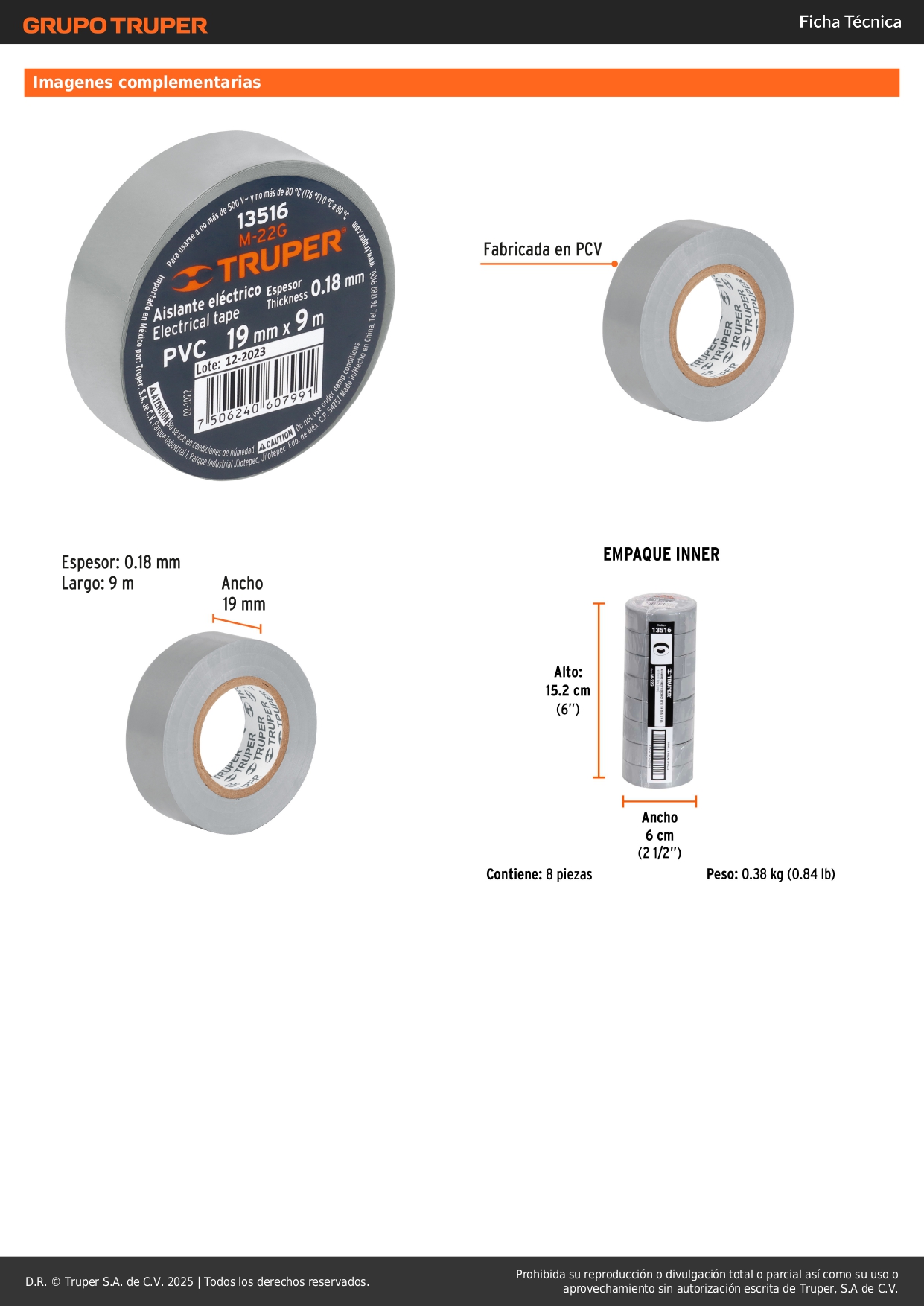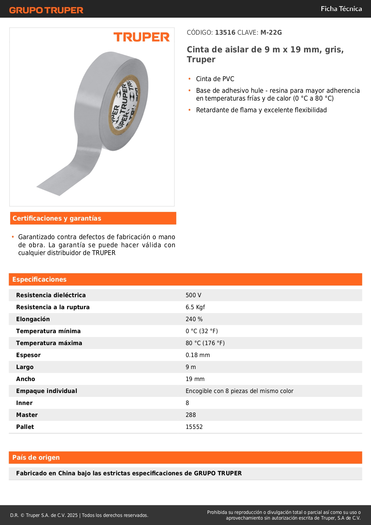 Cinta aislante de 9 m x 19 mm, gris, truper S/ 1.70 Agregar al carro Avísame cuando llegue -Cinta de PVC-Base de adhesivo hule - resina para mayor adherencia en temperaturas frías y de calor (0 °C a 80 °C)-Retardante de flama y excelente flexibilidad