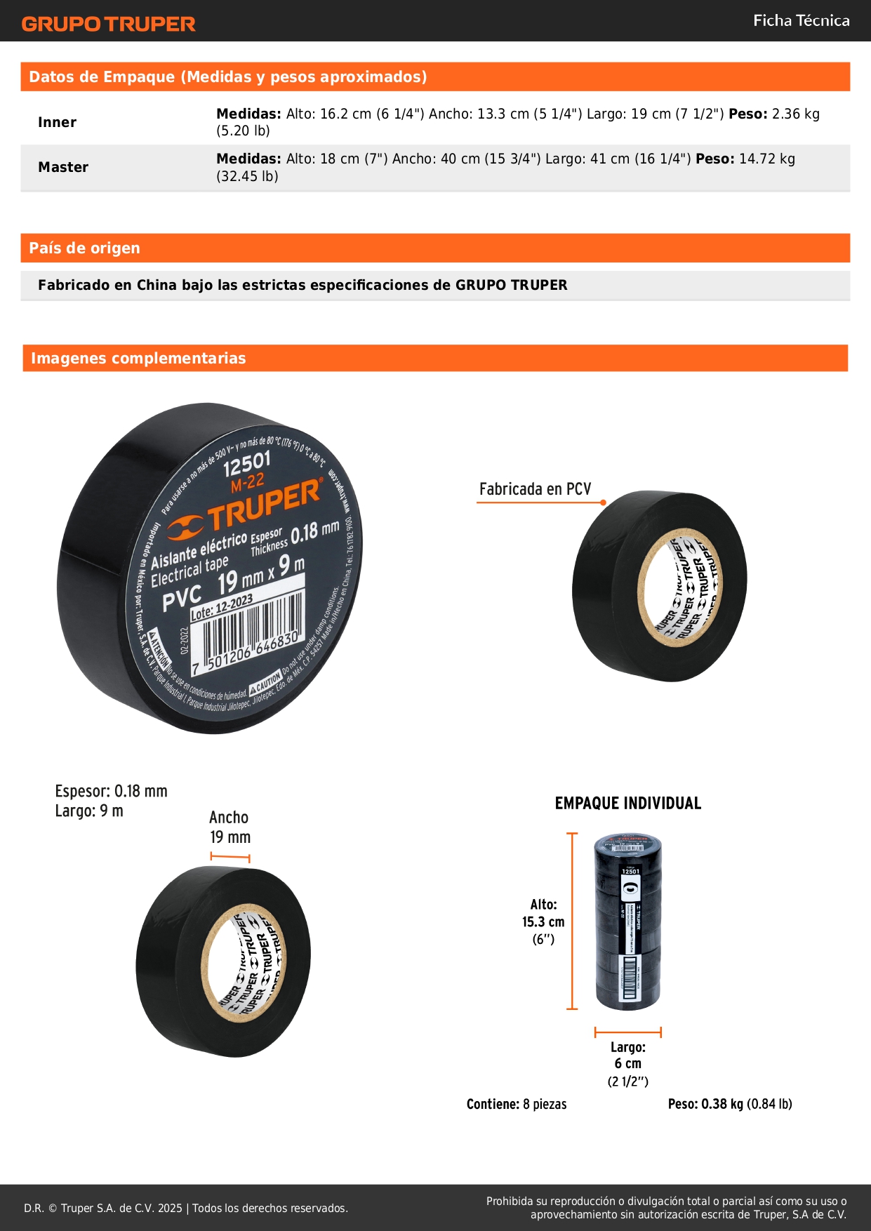Cinta aislante de 9 m x 19 mm, negra, truper S/ 1.60 Agregar al carro Avísame cuando llegue -Cinta de PVC-Base de adhesivo hule - resina para mayor adherencia en temperaturas frías y de calor (0 °C a 80 °C)-Retardante de flama y excelente flexibilidad