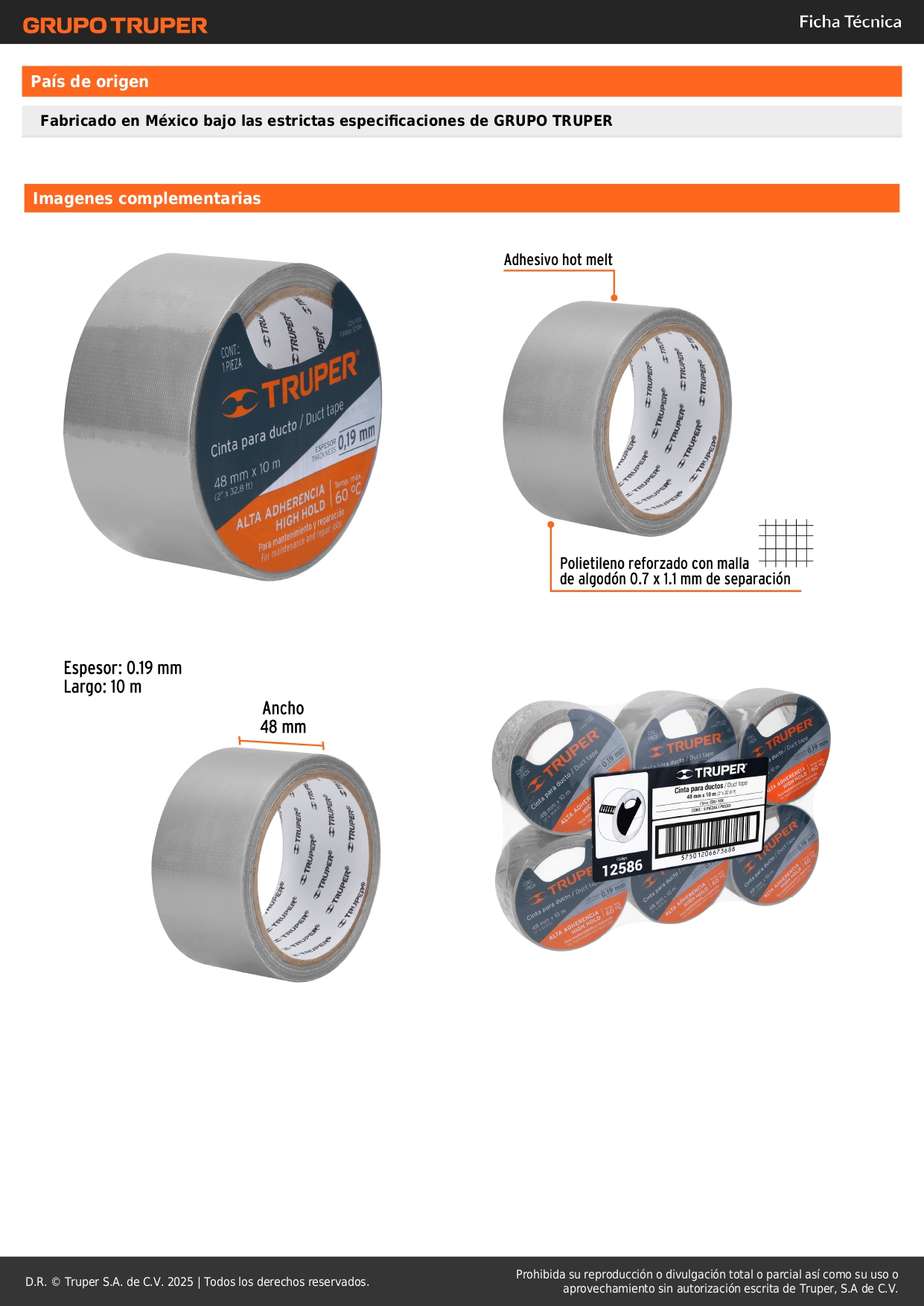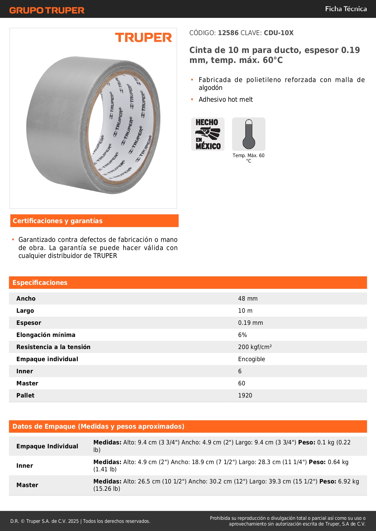 Cinta ducte tape 10 m espesor 0.19 mm temp. máx. 60°c truper S/ 5.00 Agregar al carro Avísame cuando llegue -Fabricada de polietileno reforzada con malla de algodón-Adhesivo hot melt