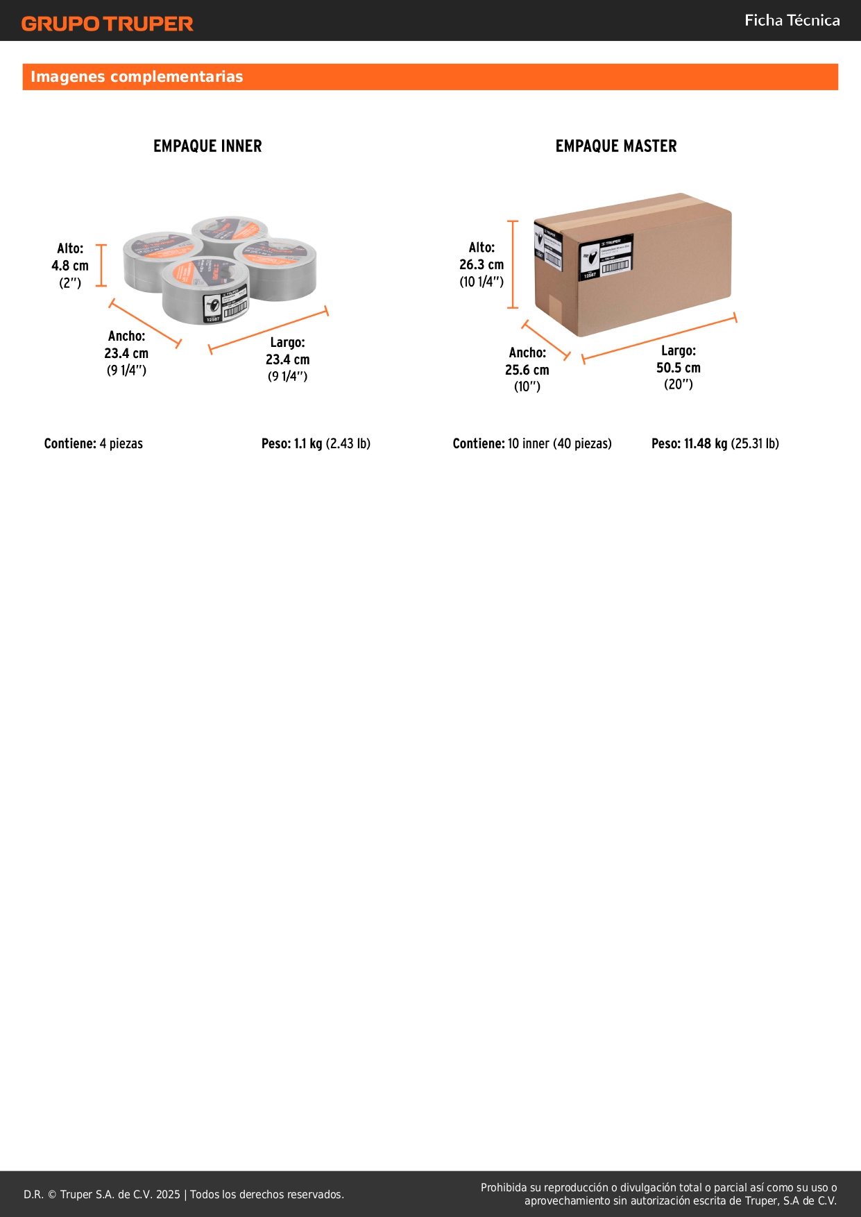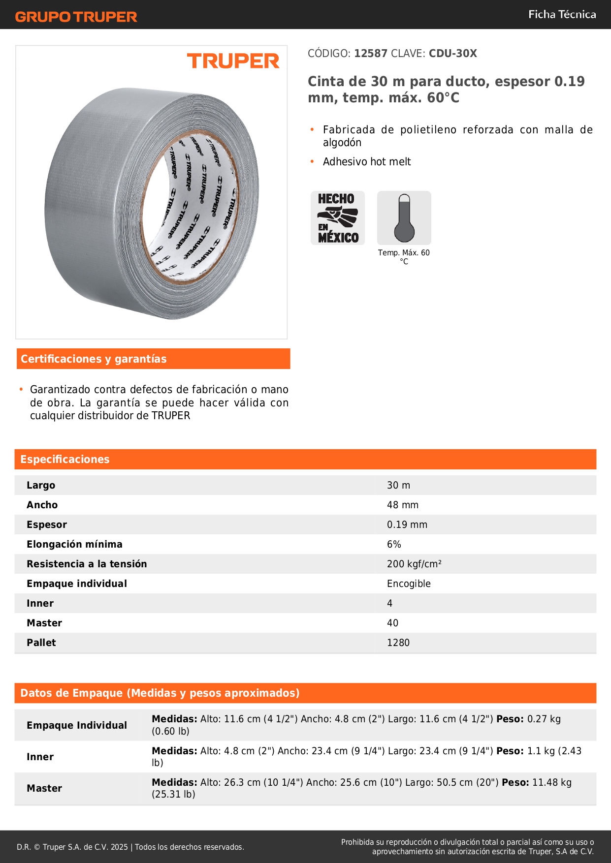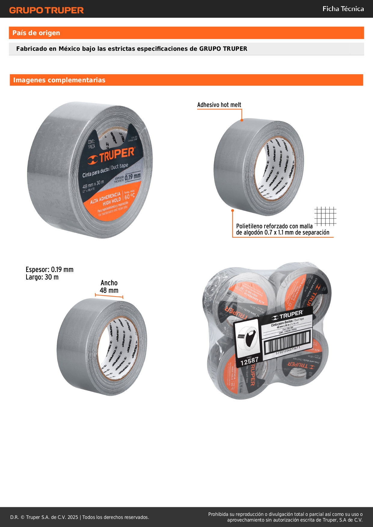 Cinta ducte tape 30 m espesor 0.19 mm. temp. máx. 60°c. truper S/ 12.80 Agregar al carro Avísame cuando llegue -Fabricada de polietileno reforzada con malla de algodón-Adhesivo hot melt