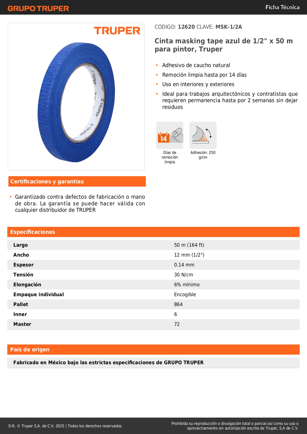 Cinta masking tape azul de 1/2" x 50 m para pintor, Truper