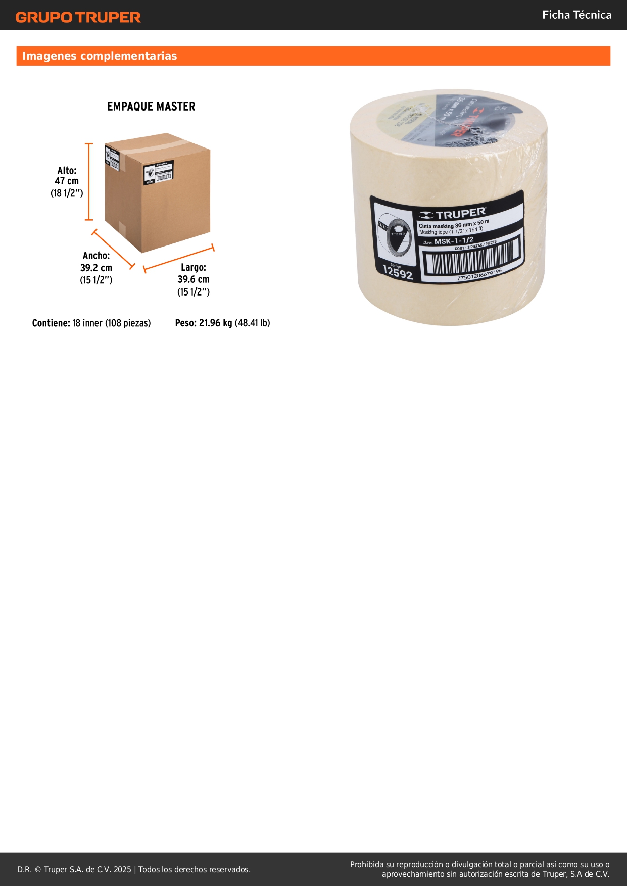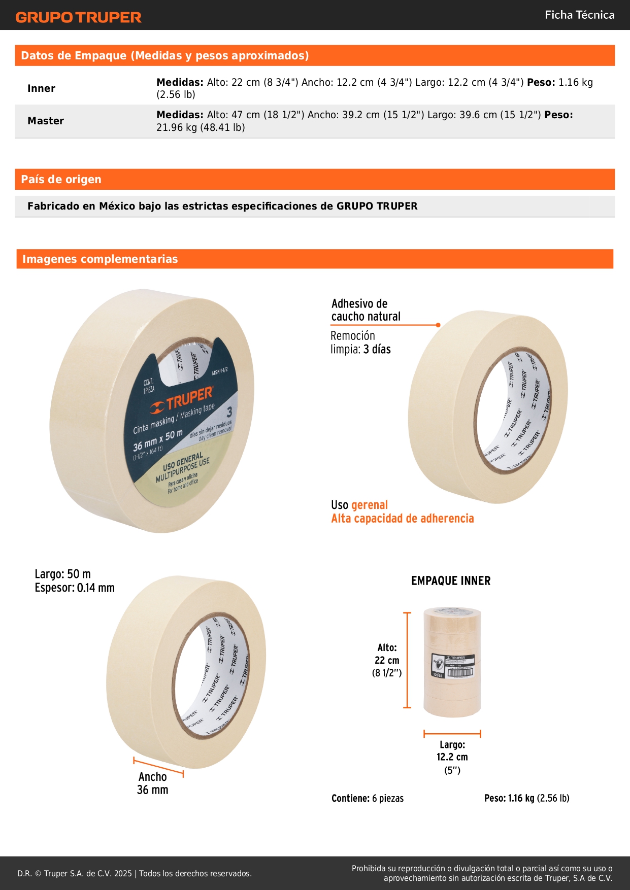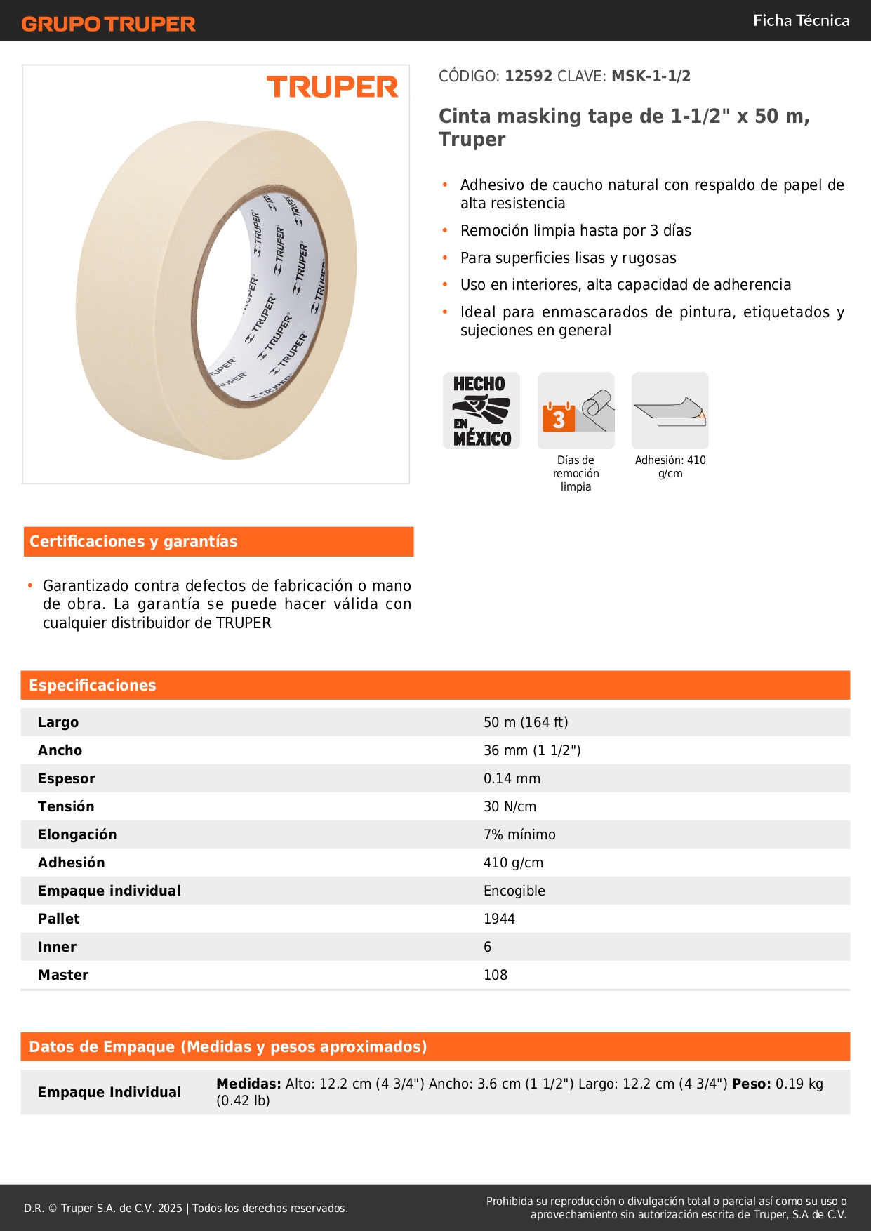 Cinta masking tape de 1-1/2'' x 50 m. truper