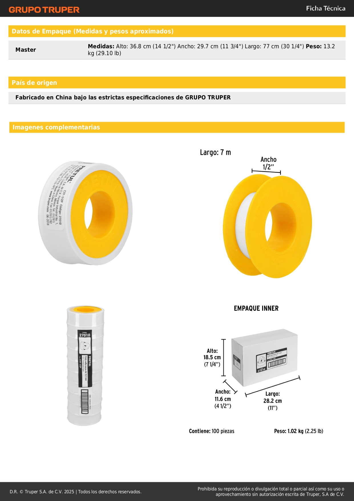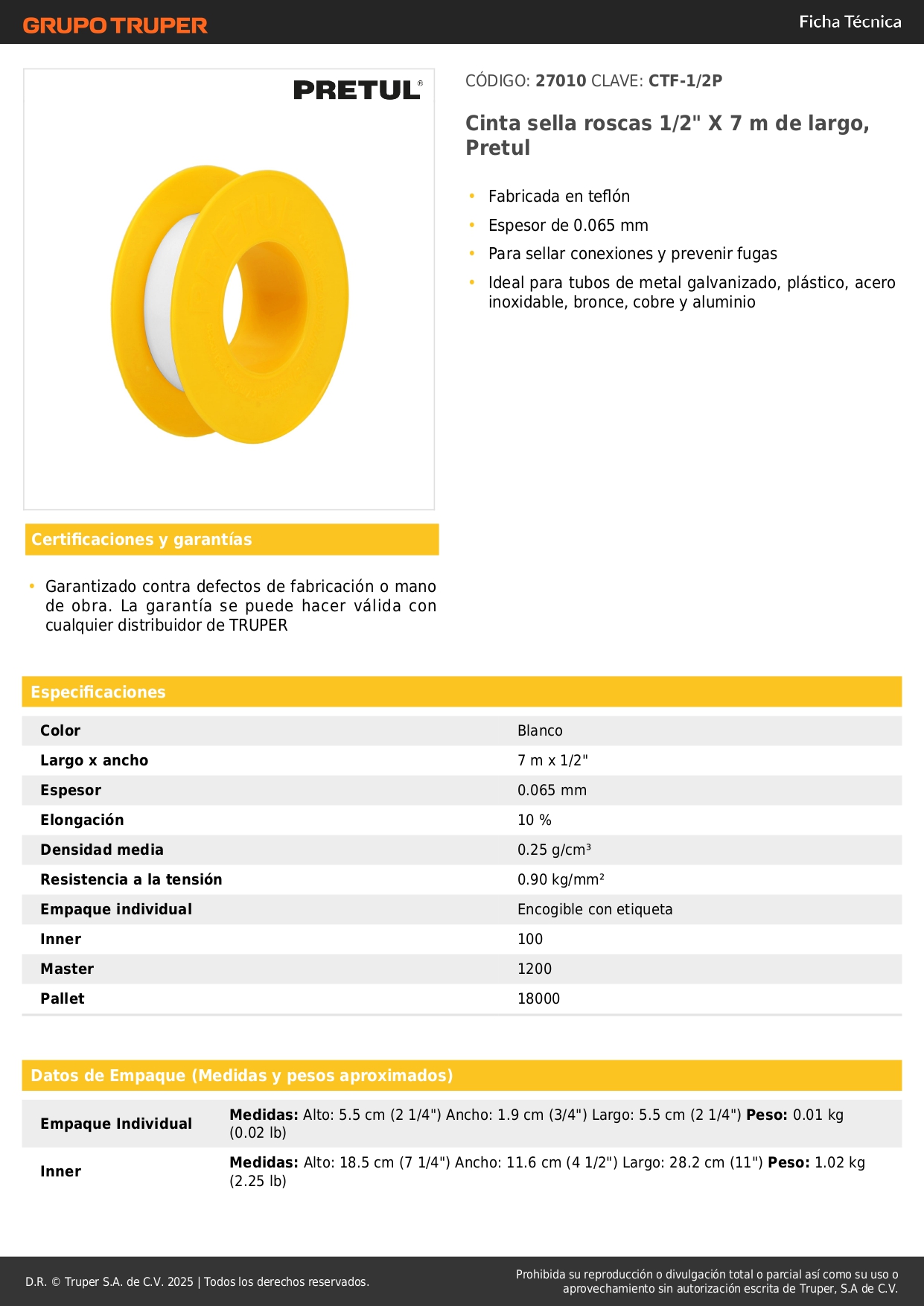 Cinta sella roscas 1/2'' x 7 m de largo pretul S/ 1.00 Agregar al carro Avísame cuando llegue -Fabricada en teflón-Espesor de 0.065 mm-Para sellar conexiones y prevenir fugas-Ideal para tubos de metal galvanizado, plástico, acero inoxidable, bronce, cobre y aluminio