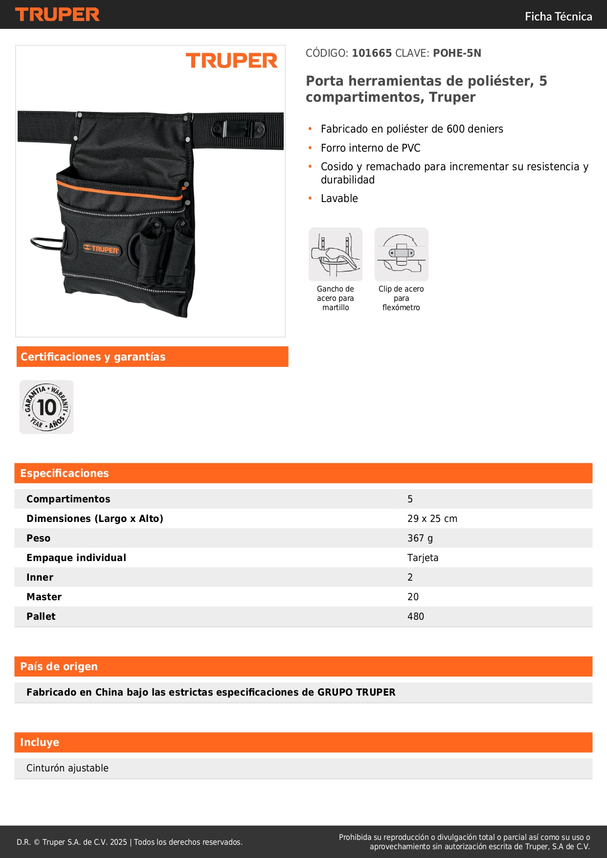 Cinturón portaherramientas de poliéster 5 compartimientos truper S/ 39.00 Agregar al carro Avísame cuando llegue -Fabricado en poliéster de 600 deniers-Forro interno de PVC-Cosido y remachado para incrementar su resistencia y durabilidad-Lavable
