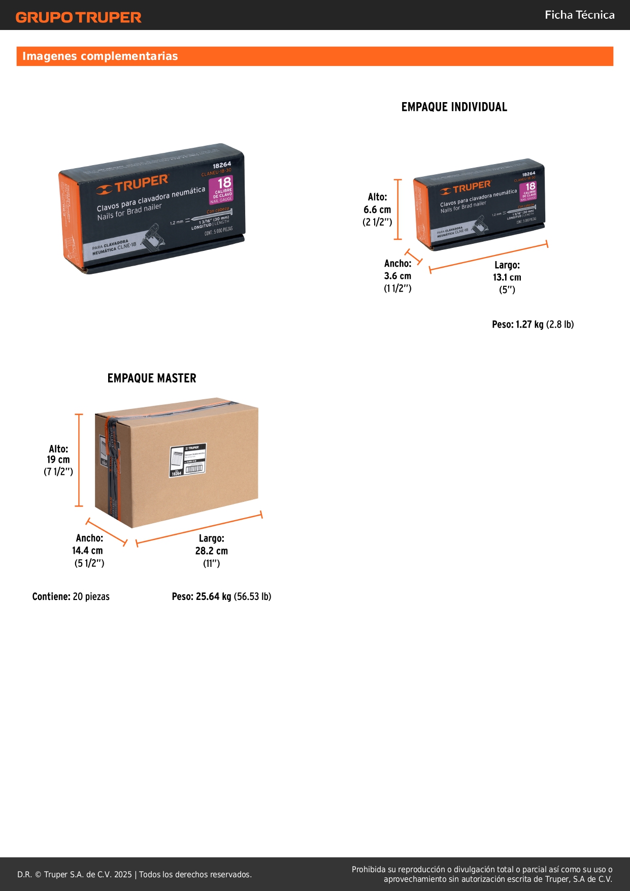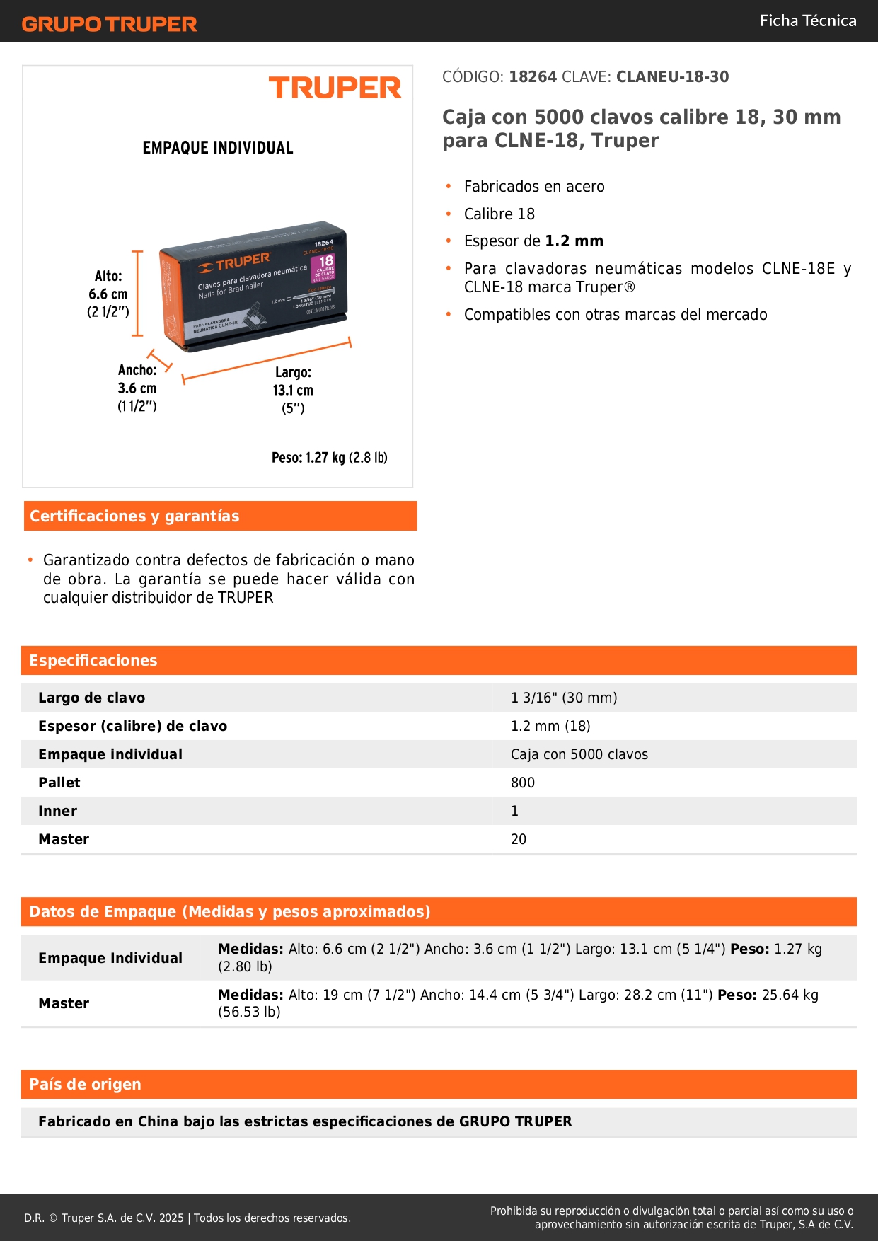 Caja con 5000 clavos calibre 18, 30 mm para CLNE-18, TRUPER