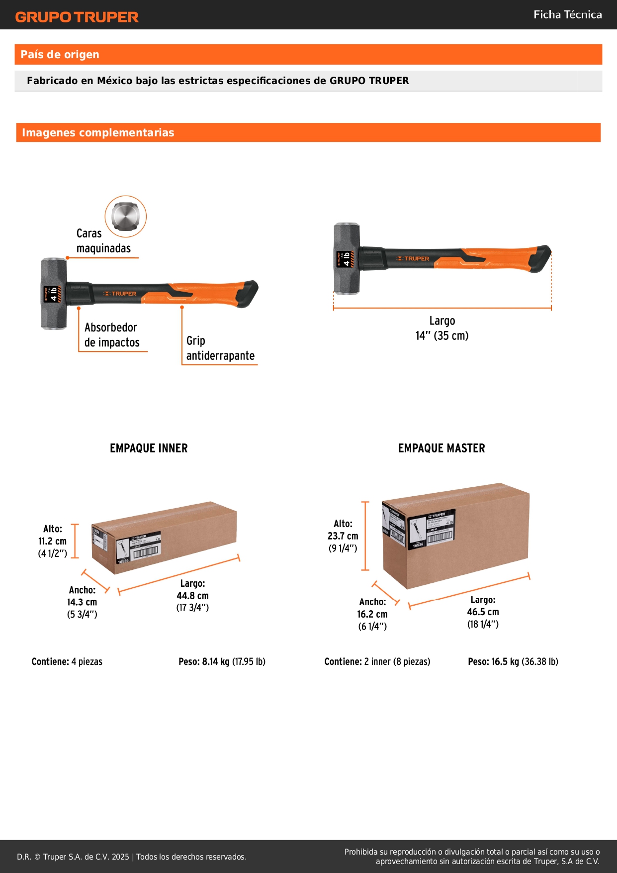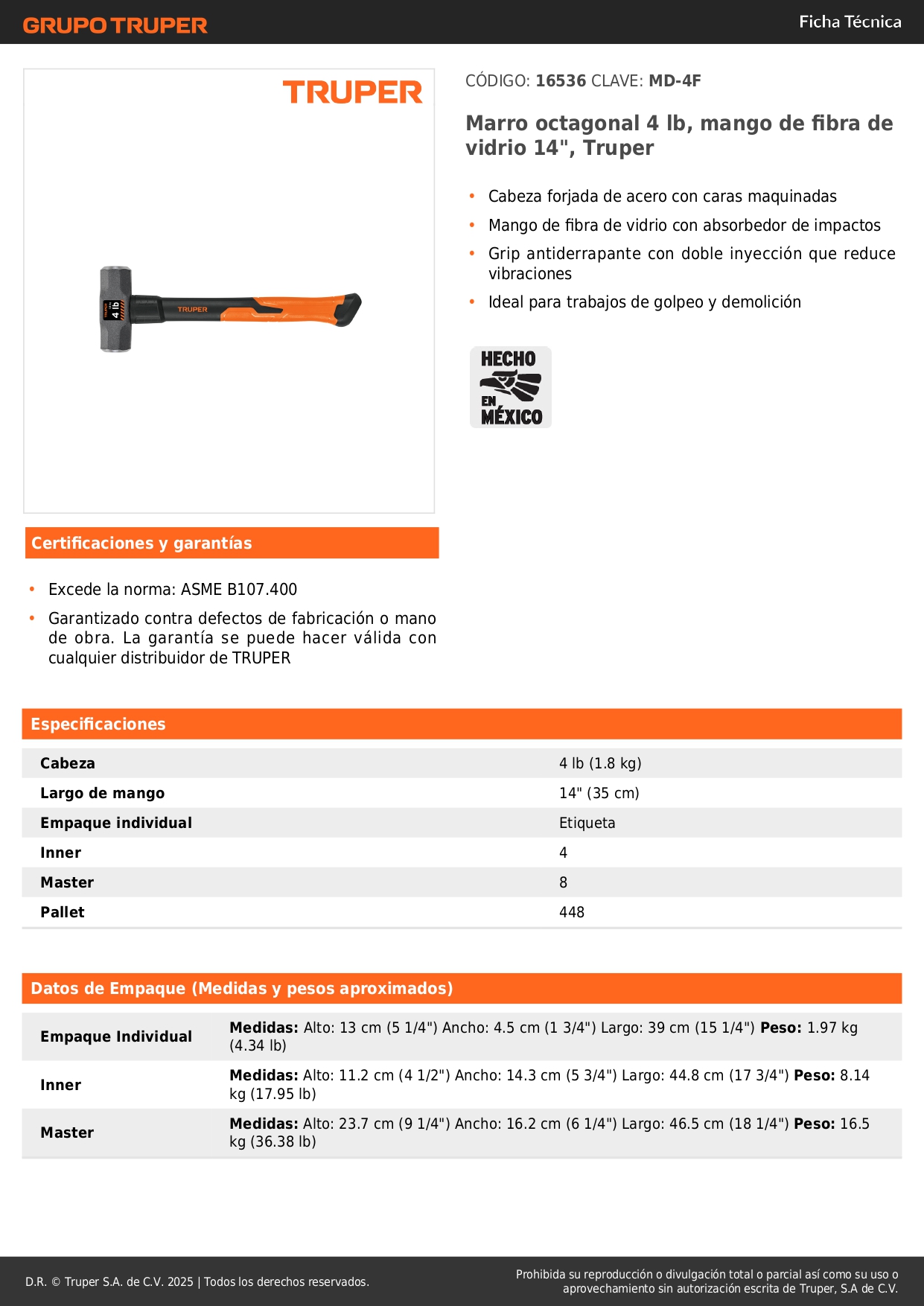 Marro octagonal 4 lb, mango de fibra de vidrio 14", Truper