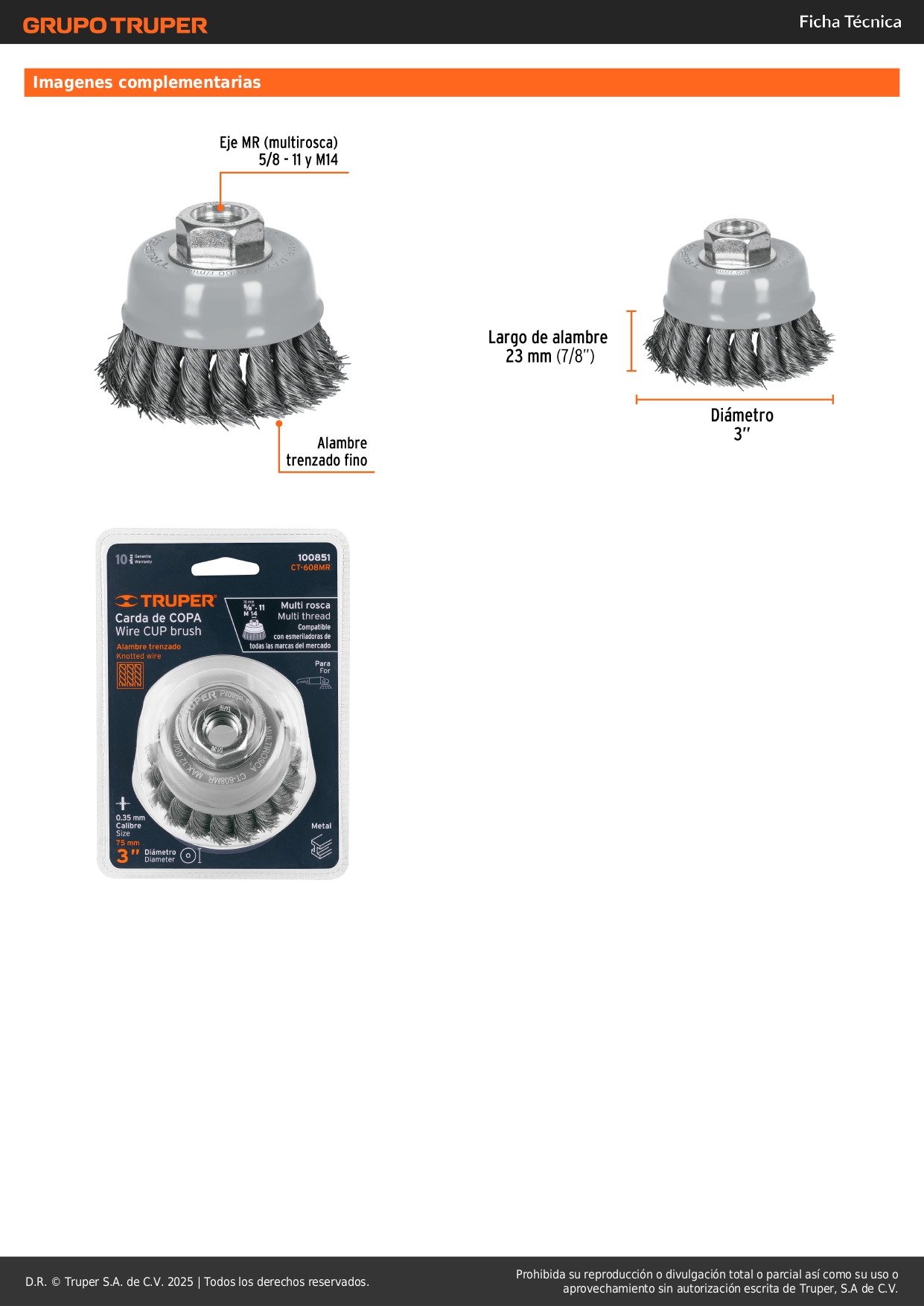 3 Carda copa 3" alambre trenzado fino, Multi-rosca, Truper
