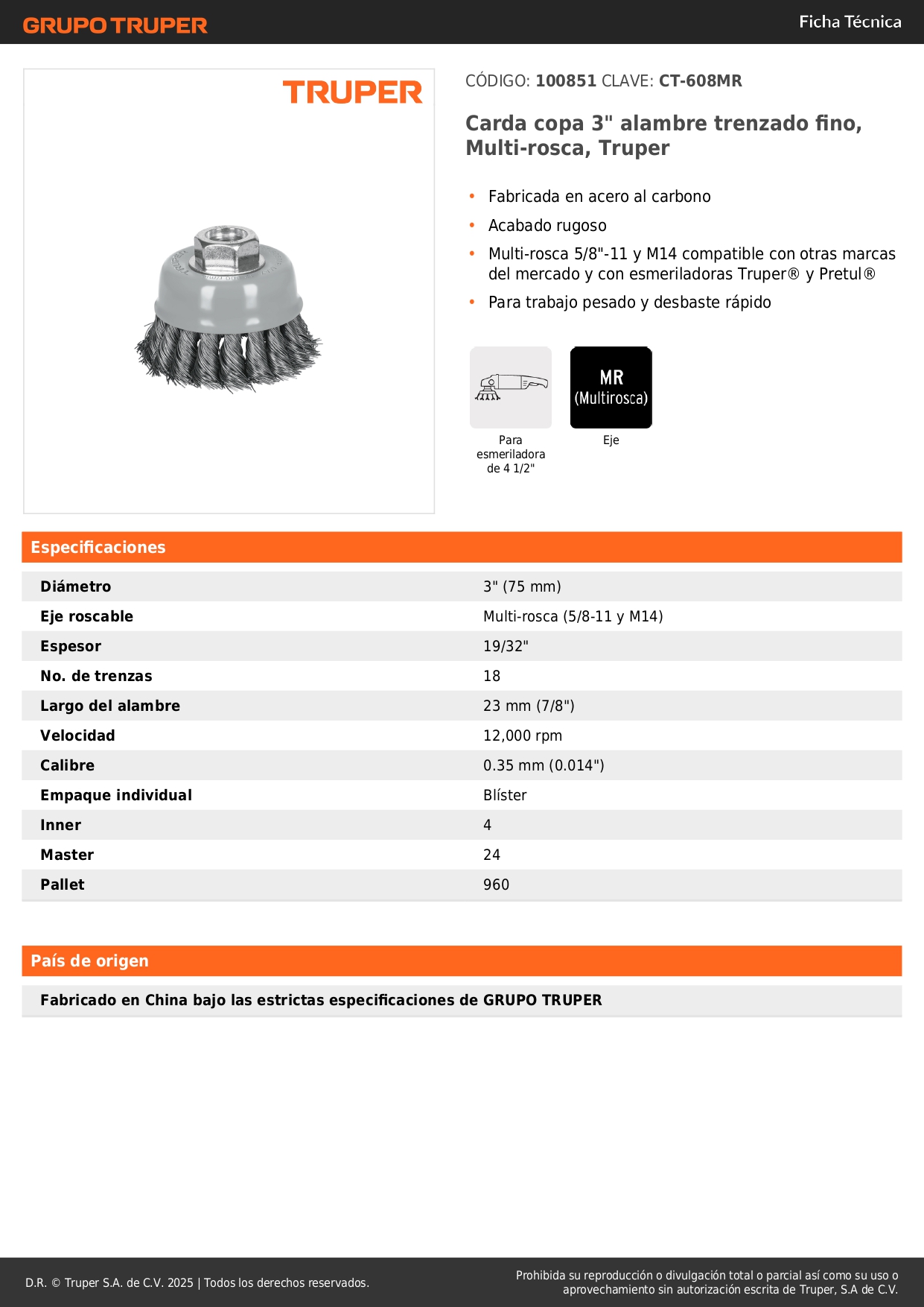 • Multi-rosca 5/8"-11 y M14 compatible con otras marcas del mercado y con esmeriladoras Truper® y Pretul®