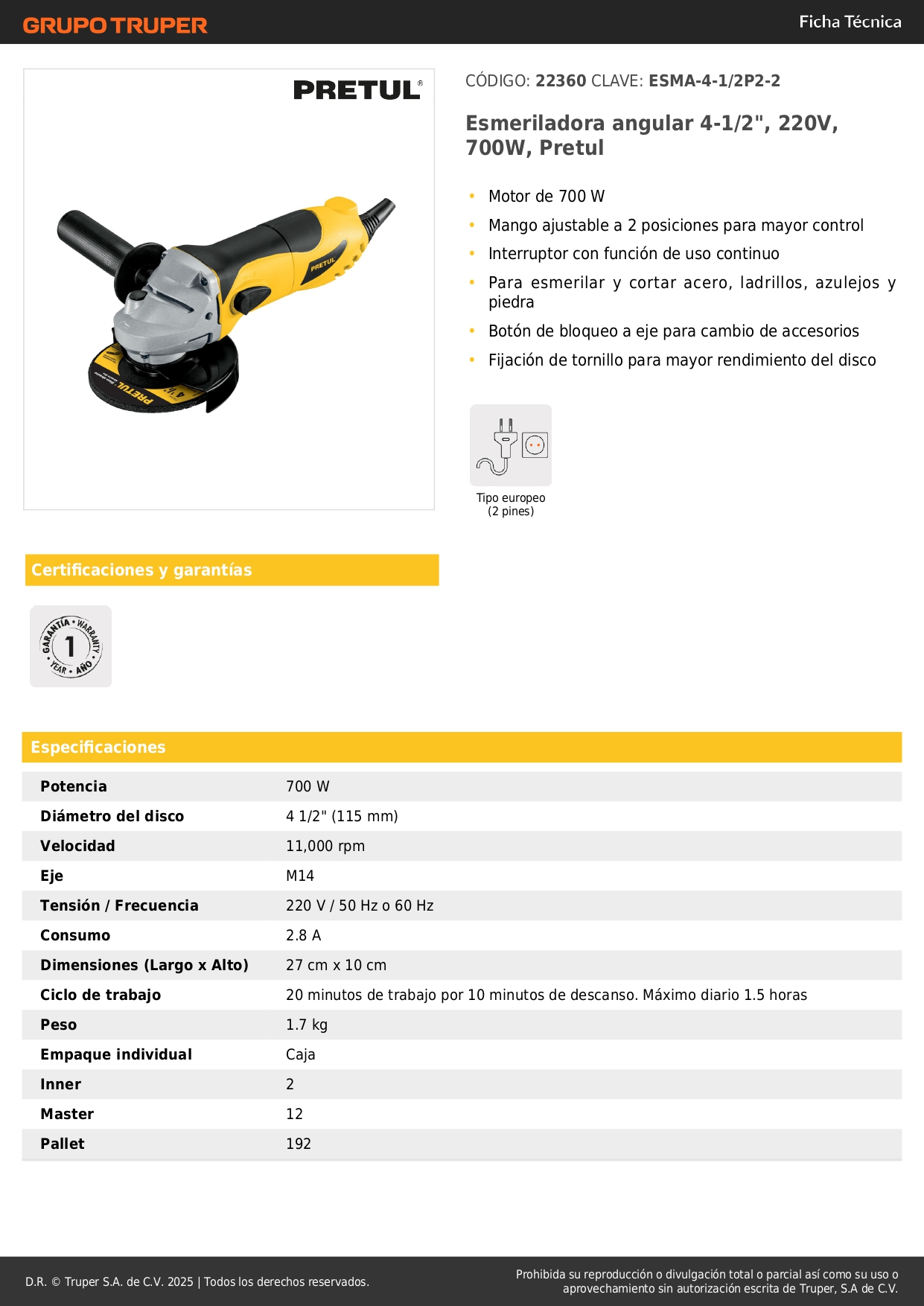 *Ciclo de trabajo30 minutos de trabajo por 15 minutos de descanso. Máximo diario: 6 horas