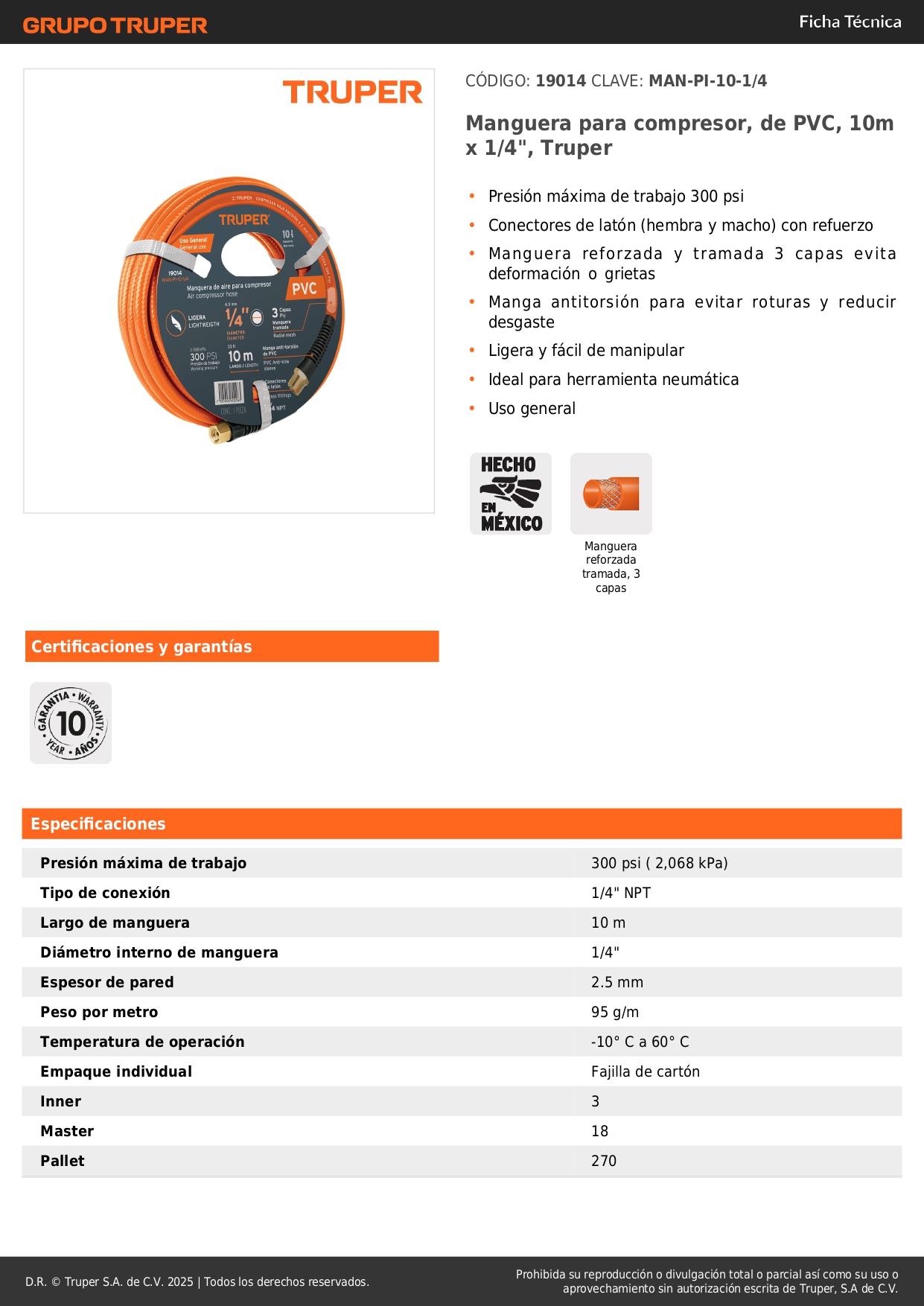 Manguera reforzada y tramada 3 capas evita deformación o grietas