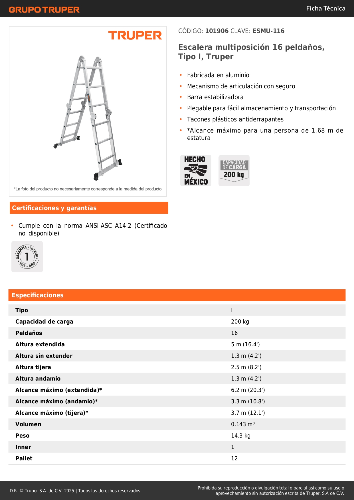 Alcance máximo (tijera)* 3.5 m (11.5')