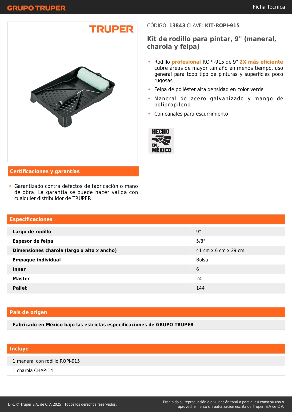 - Rodillo profesional ROPI-915 de 9" 2X más eficiente cubre áreas de mayor tamaño en menos tiempo, uso general para todo tipo de pinturas y superficies rugosas.