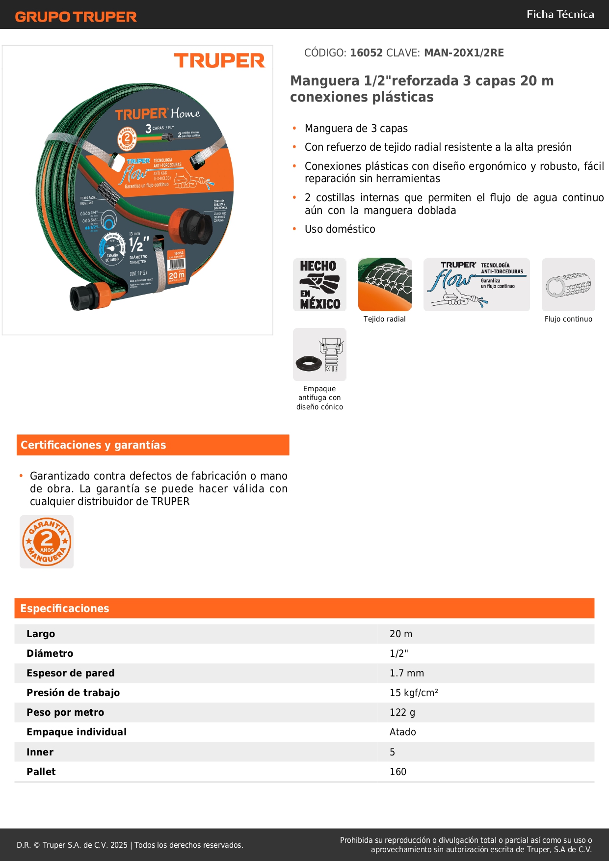 -2 costillas internas que permiten el flujo de agua continuo aún con la manguera doblada
