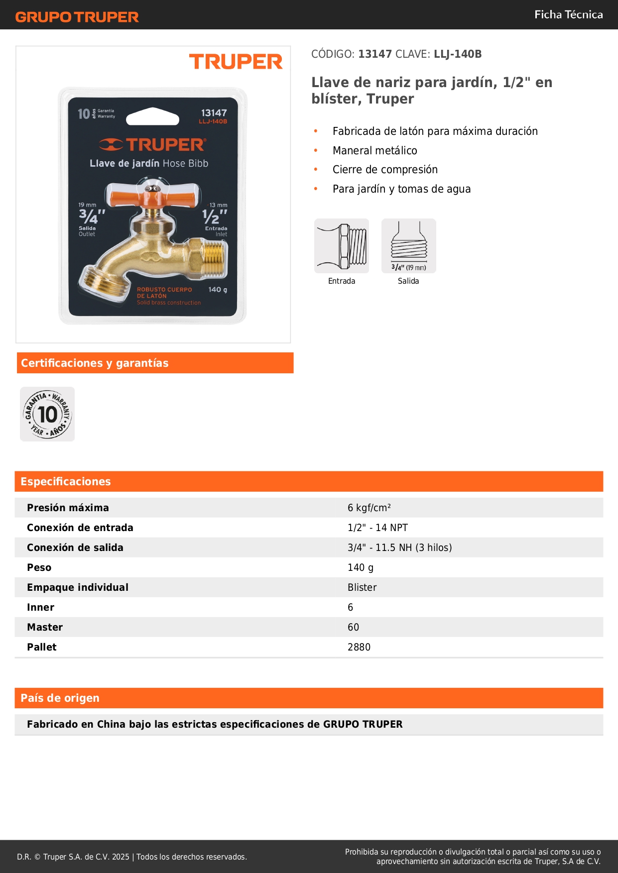 - Fabricada de latón para máxima duración.
