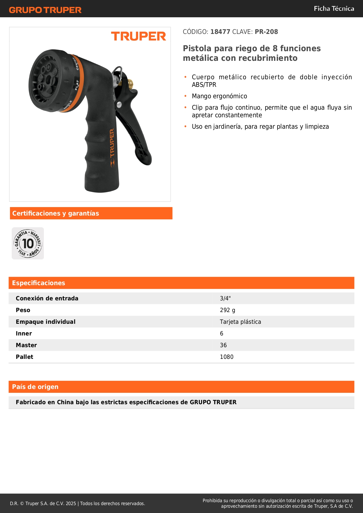 Pistola para riego de 8 funciones metálica con recubrimiento