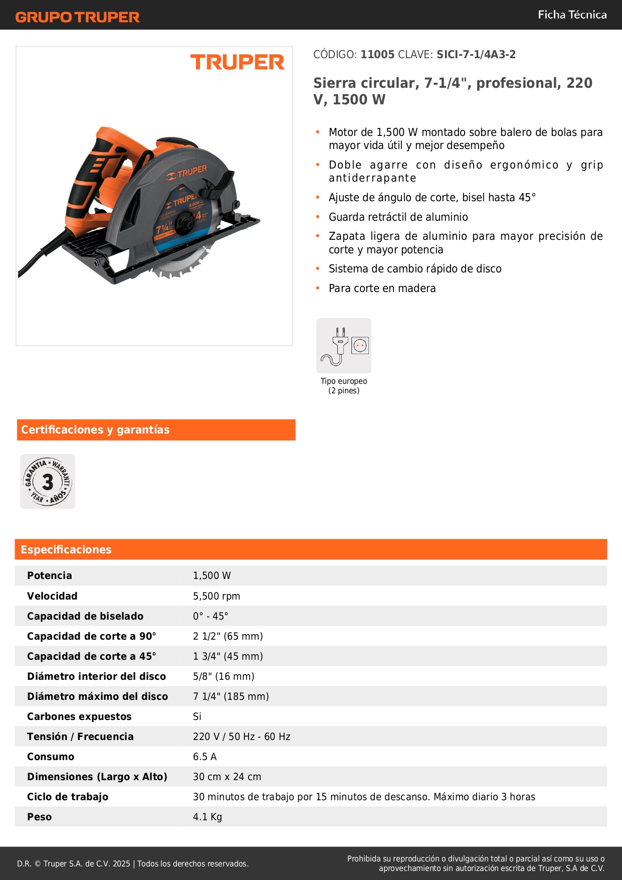 - Ciclo de trabajo 30 minutos de trabajo por 15 minutos de descanso. Máximo diario 3 horas