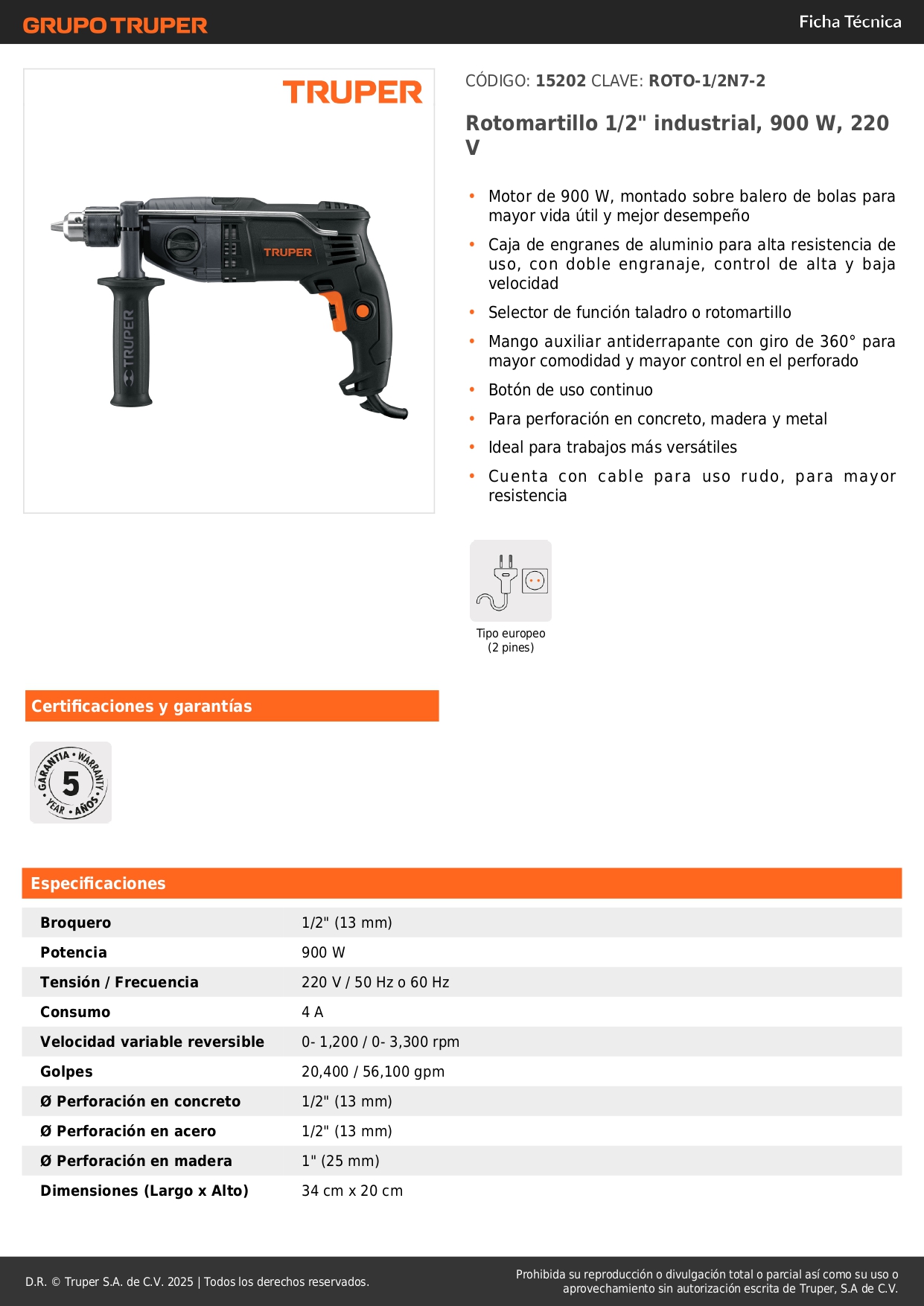 Rotomartillo 1/2" industrial, 900 W, 220 V
