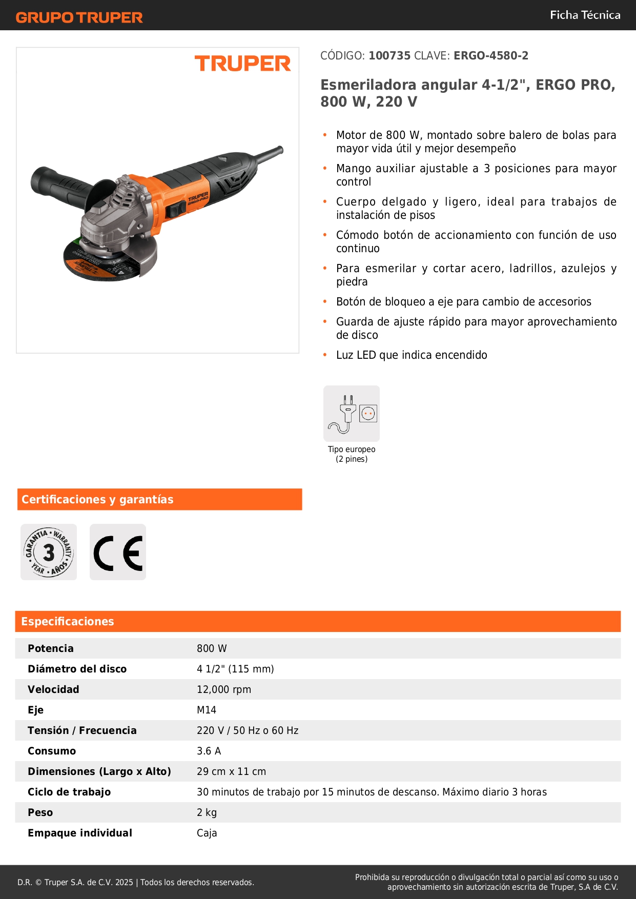 Esmeriladora angular 4-1/2", ERGO PRO, 800 W, 220 V