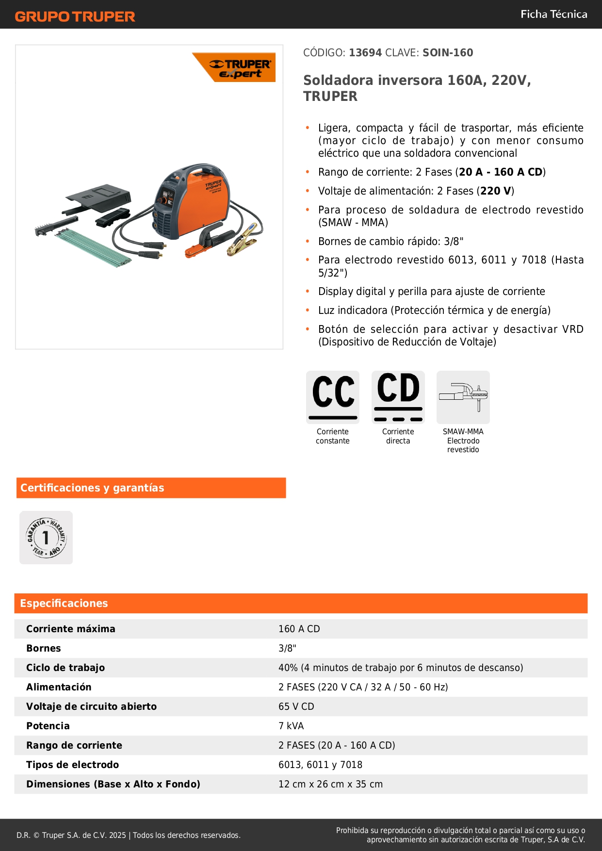 Combo soldadora inversora 160 a + mascara de soldar truper