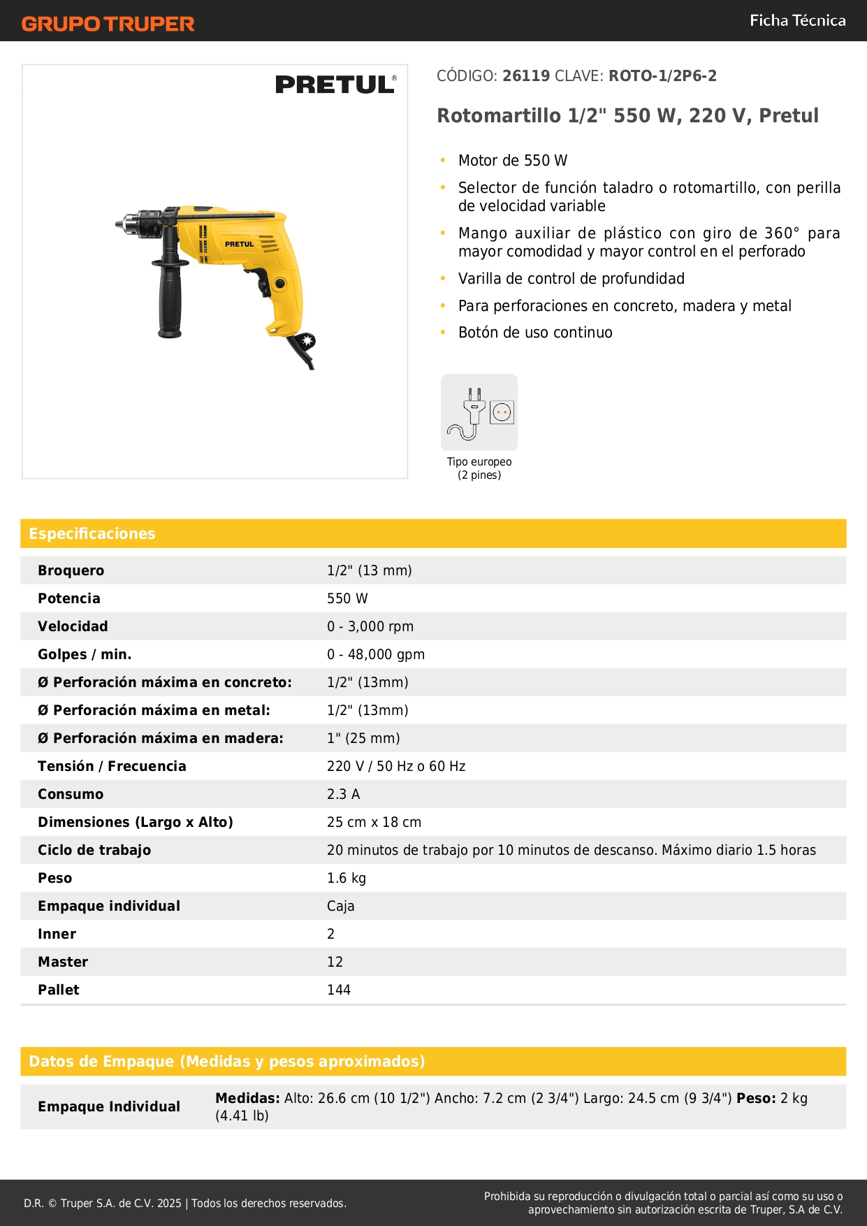Rotomartillo 1/2", 550W, PRETUL