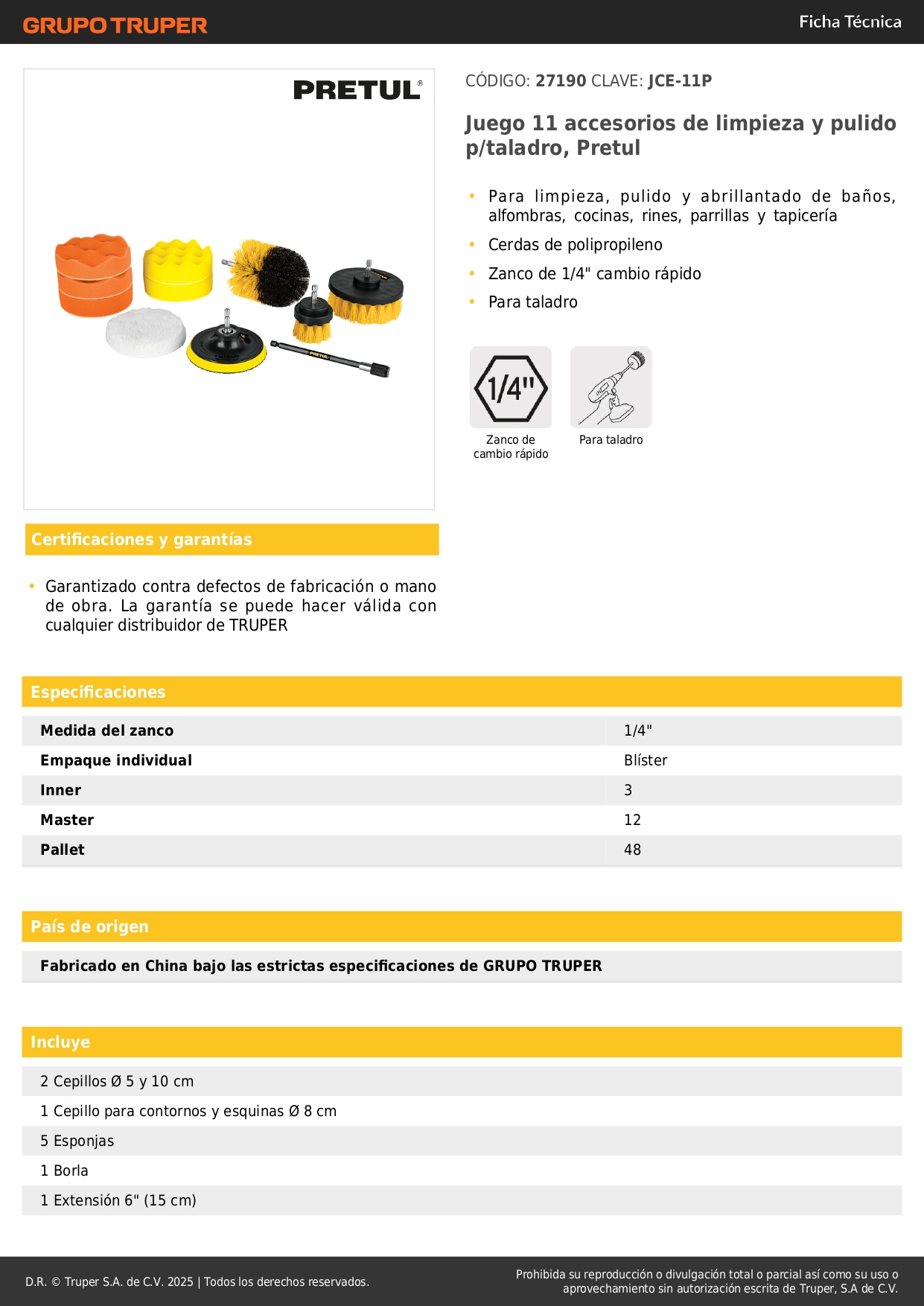 Juego 11 accesorios de limpieza y pulido p/taladro, Pretul