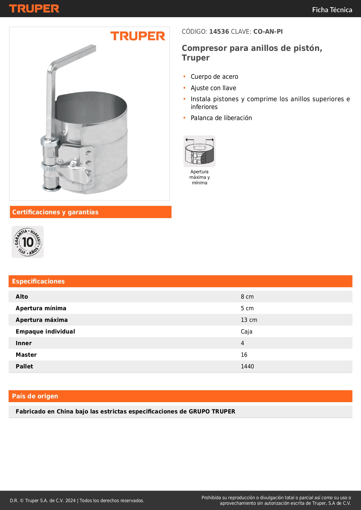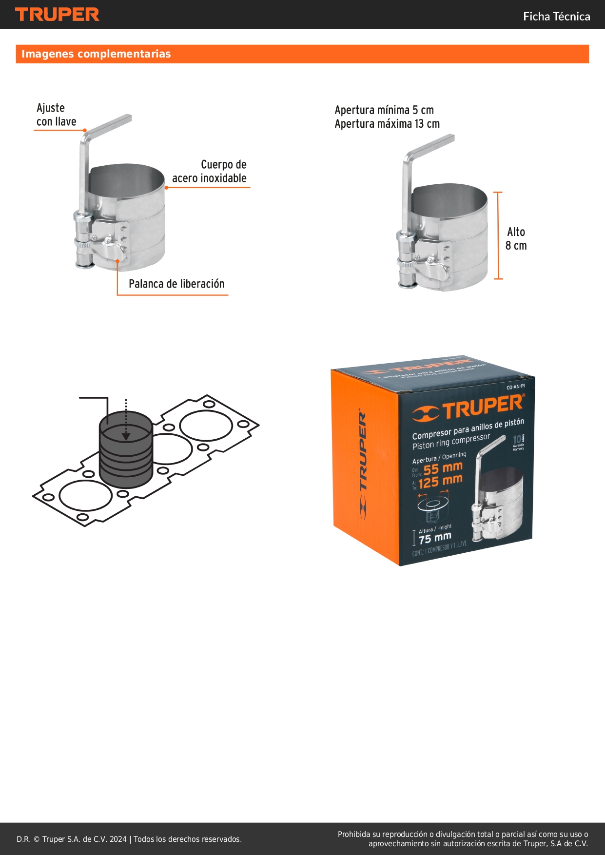Compresor para anillos de pistón de gasolina, truper S/ 38.30 Agregar al carro Avísame cuando llegue -Cuerpo de acero-Ajuste con llave-Instala pistones y comprime los anillos superiores e inferiores-Palanca de liberación