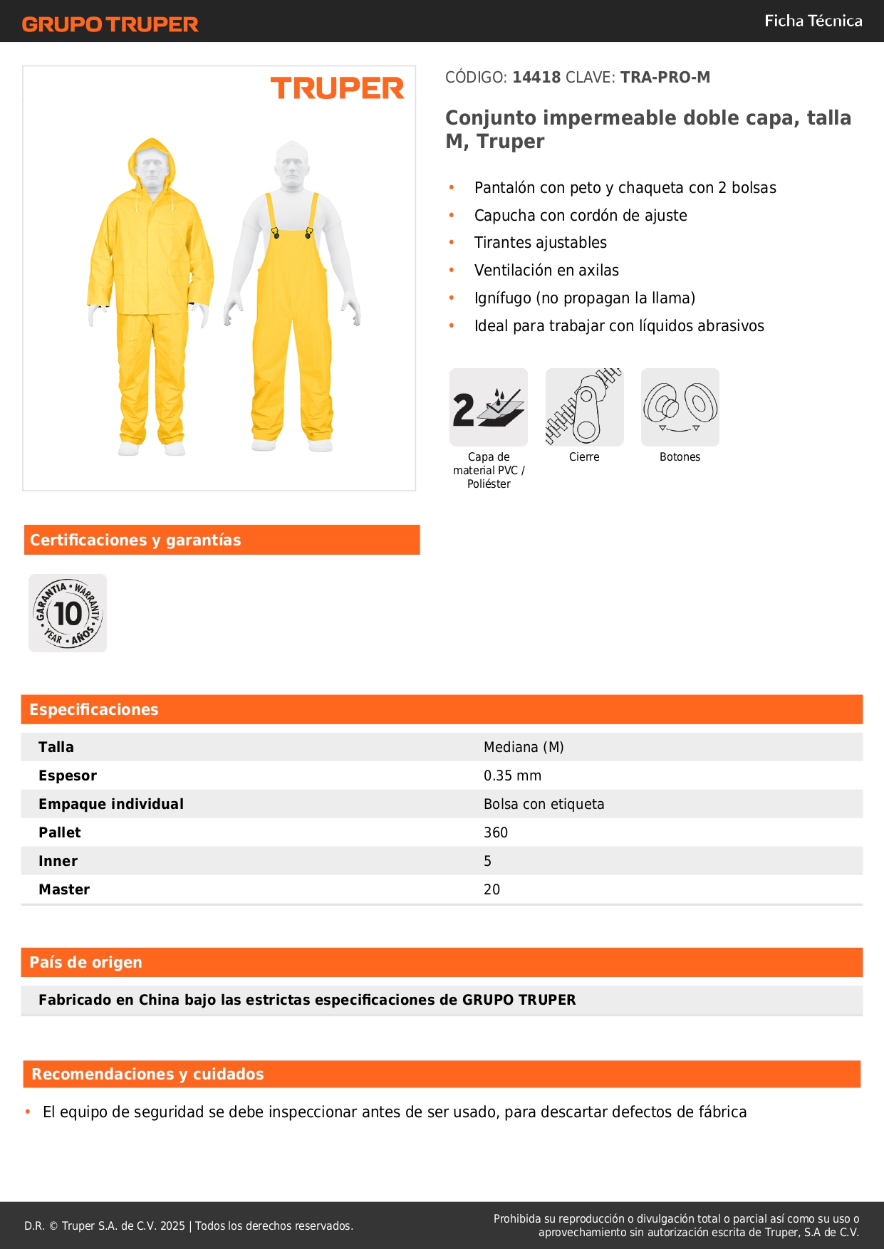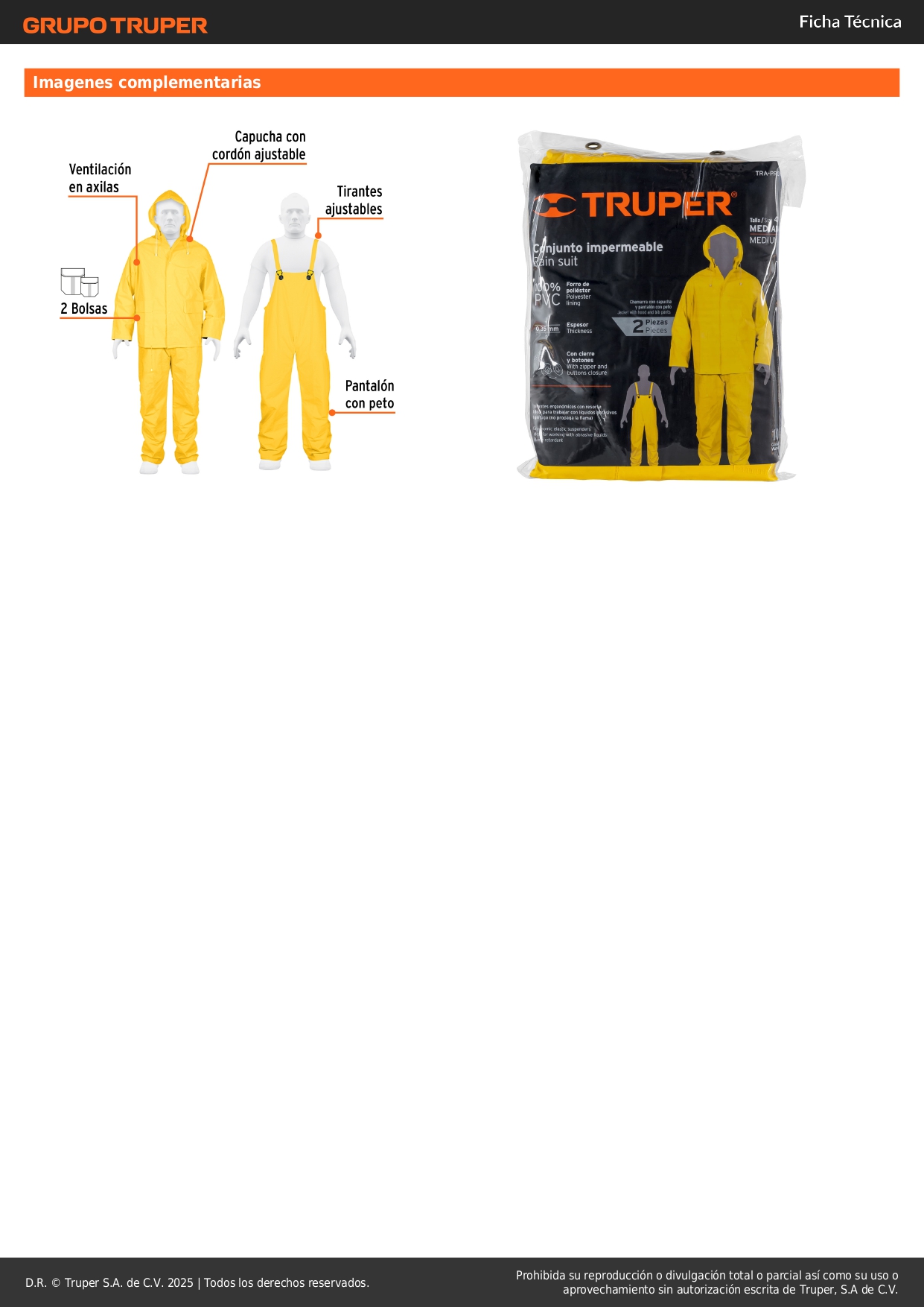 Conjunto impermeable doble capa, talla m, truper S/ 48.90 Agregar al carro Avísame cuando llegue -Pantalón con peto y chaqueta con 2 bolsas-Capucha con cordón de ajuste-Tirantes ajustables-Ventilación en axilas-Ignífugo (no propagan la llama)