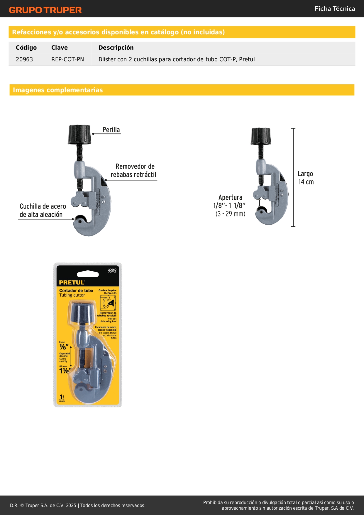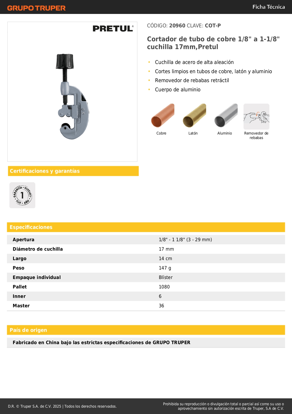 Cortador de tubo de cobre hasta 1-18 30 mm S/ 20.80 Agregar al carro Avísame cuando llegue -Cuchilla de acero de alta aleación-Cortes limpios en tubos de cobre, latón y aluminio-Removedor de rebabas retráctil-Cuerpo de aluminio