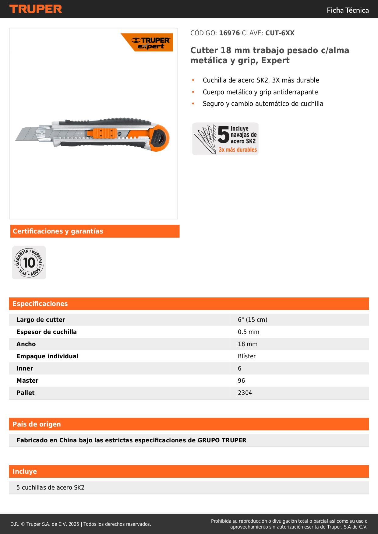 • Cuchilla de acero SK2, 3X más durable
