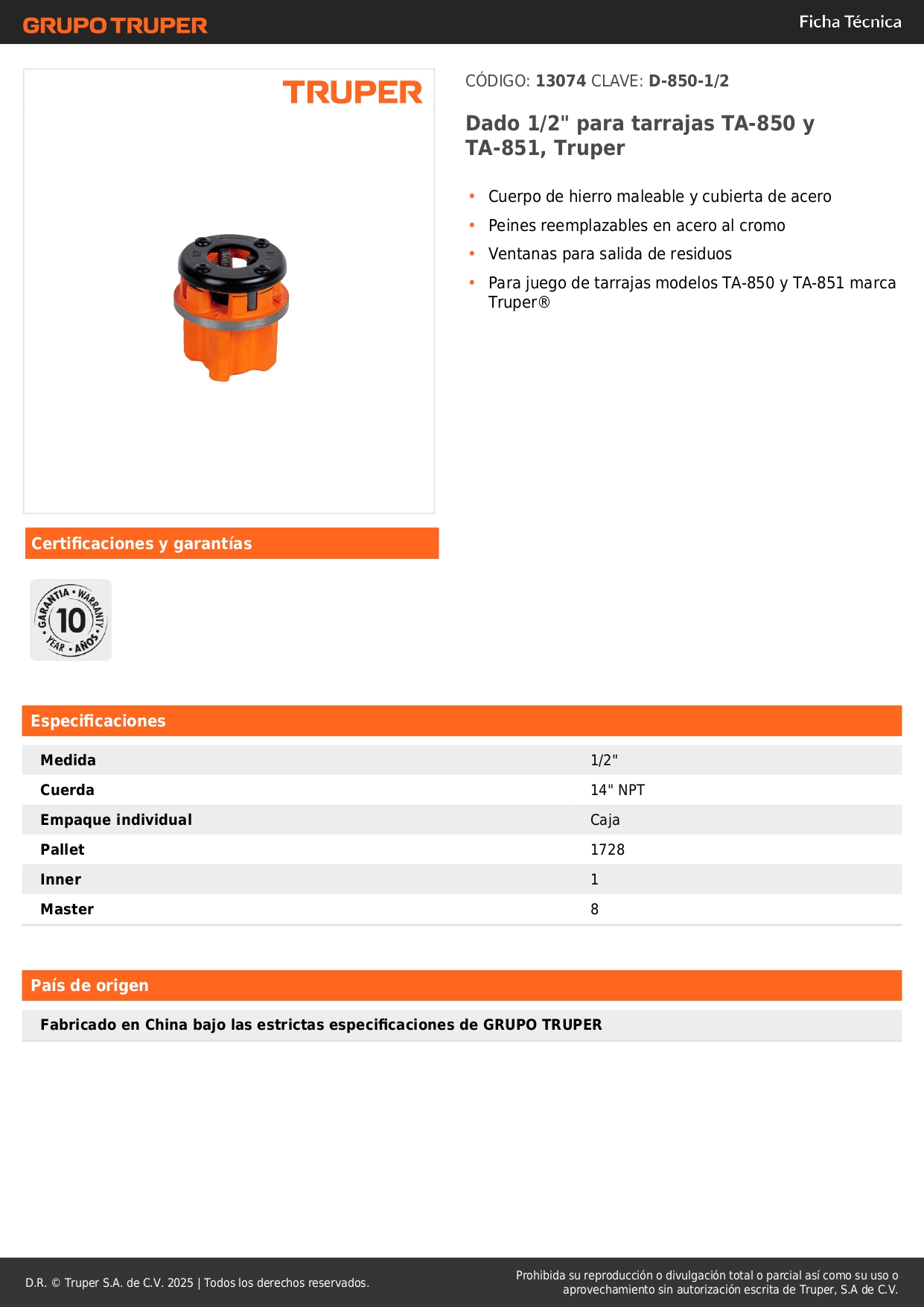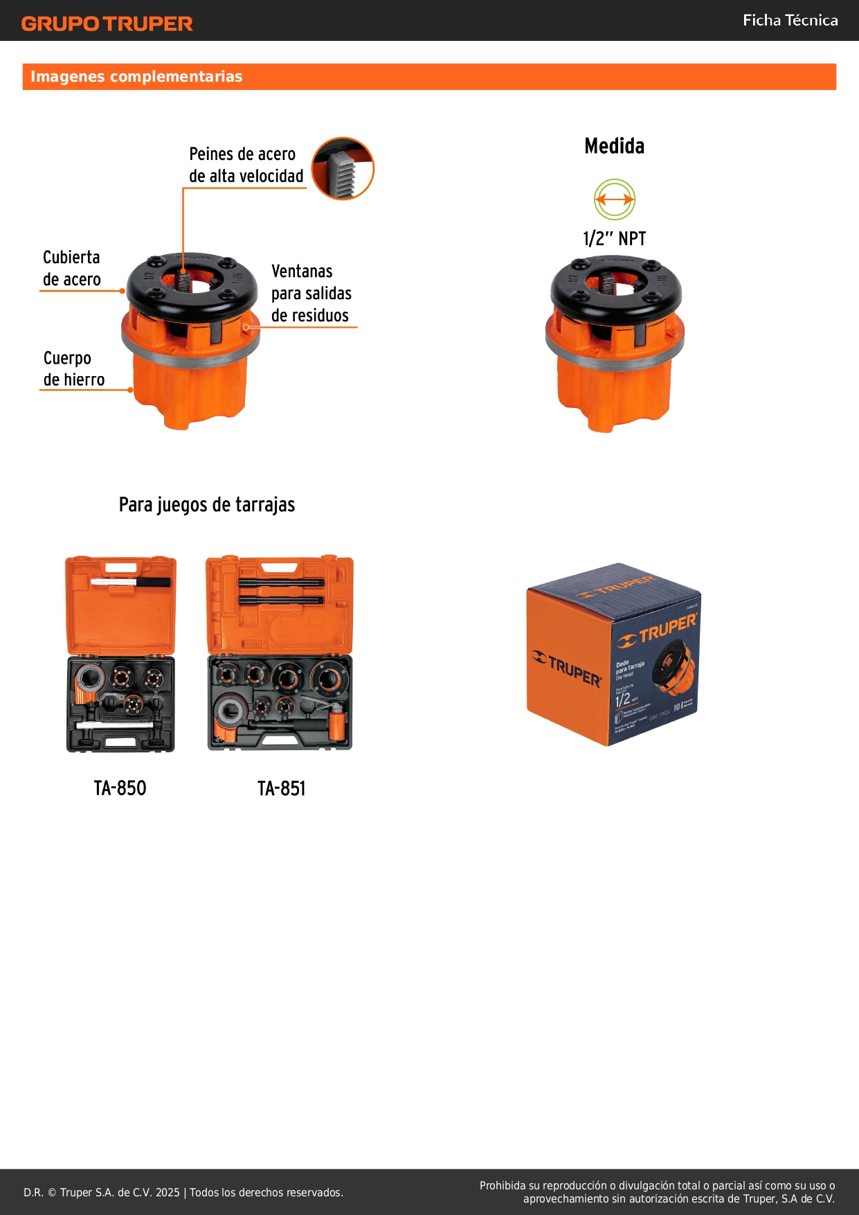 Dado 1/2´´ para tarrajas ta-850 y ta-851, truper S/ 38.30 Agregar al carro Avísame cuando llegue -Cuerpo de hierro maleable y cubierta de acero-Peines reemplazables en acero al cromo-Ventanas para salida de residuos-Para juego de tarrajas modelos TA-850 y TA-851 marca Truper®