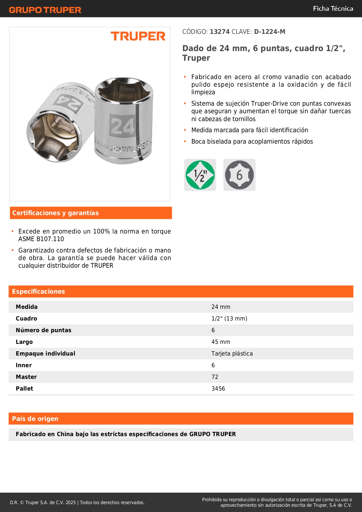 Dado hexagonal encastre 1/2'' de 24 mm truper
