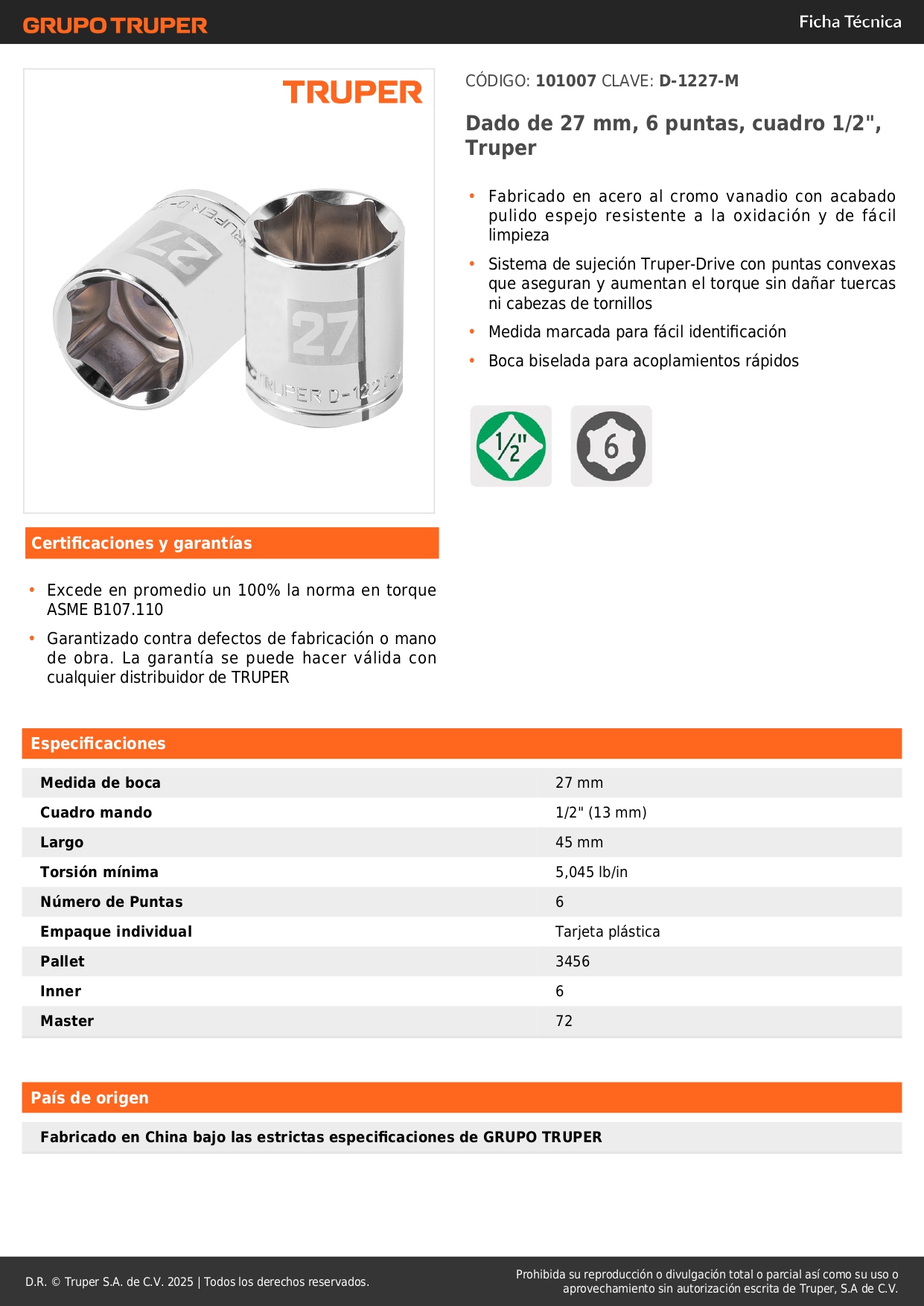 Dado hexagonal encastre 1/2'' de 27 mm truper