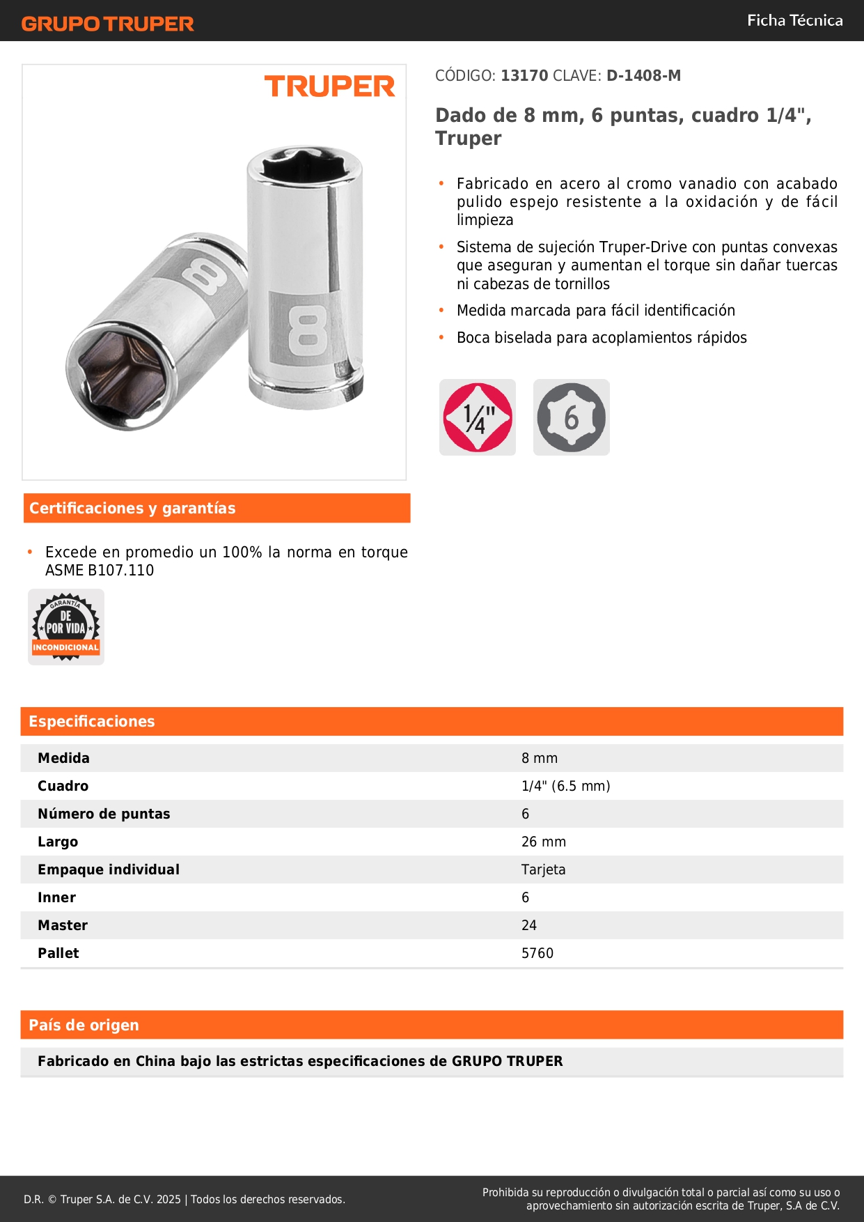Dado hexagonal encastre 1/4'' de 8 mm truper