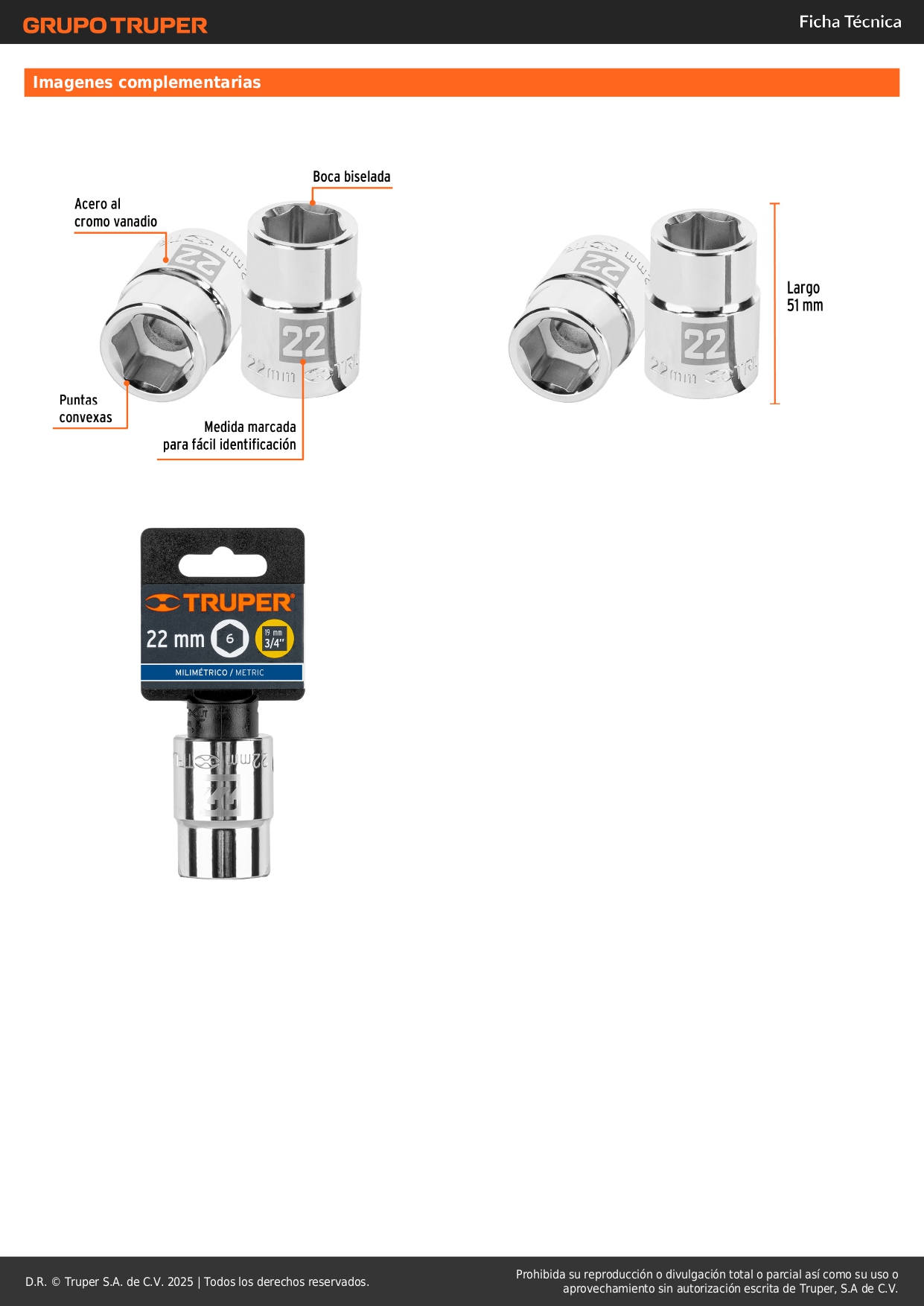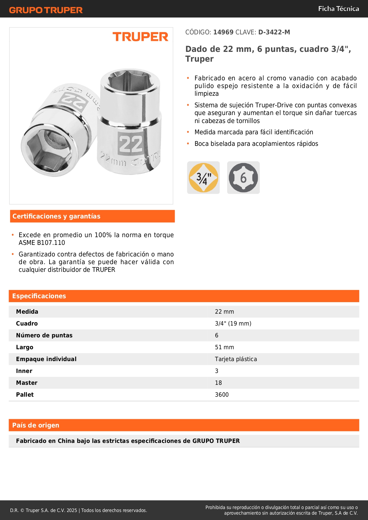Dado hexagonal encastre 3/4´´ de 22 mm, truper