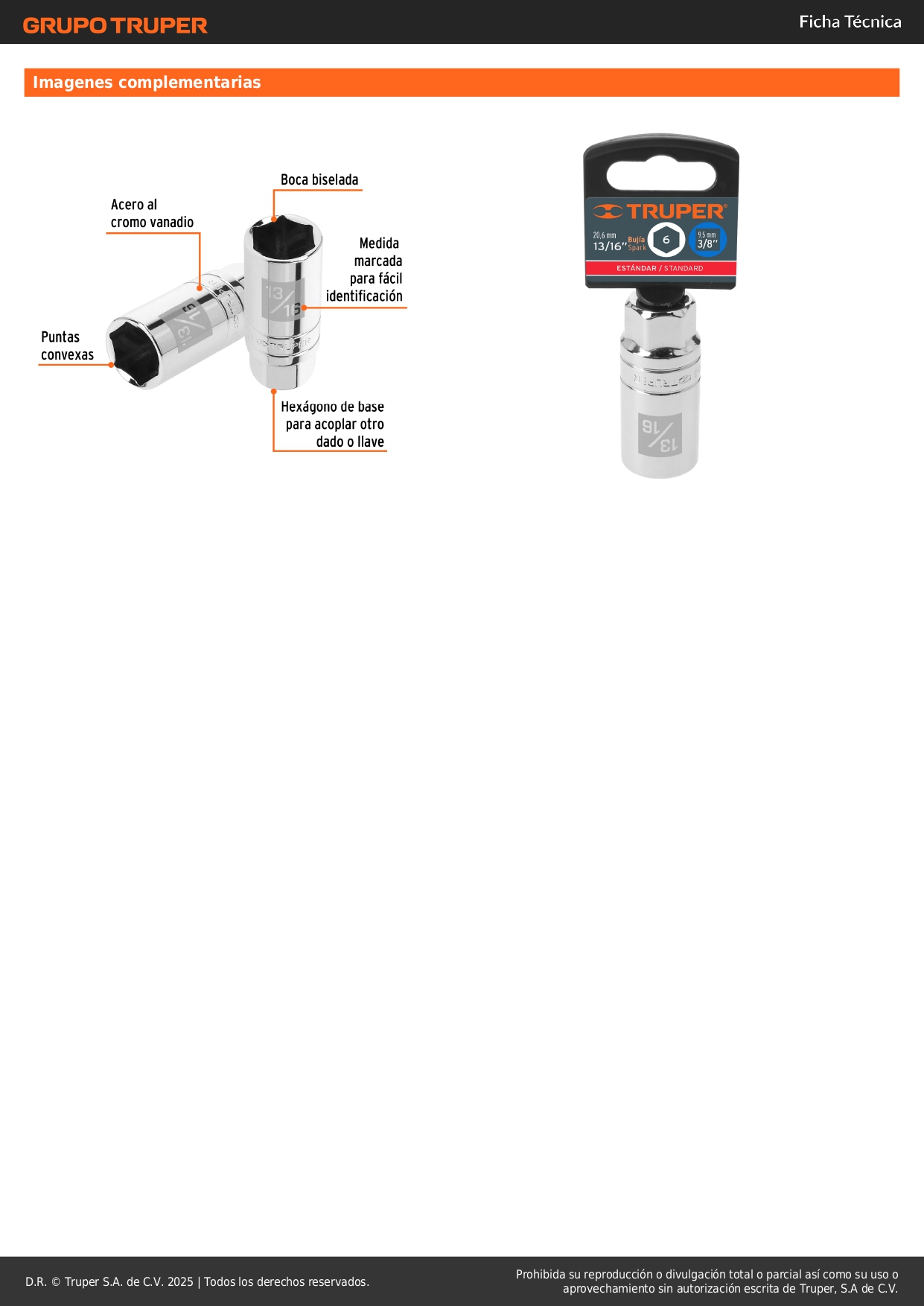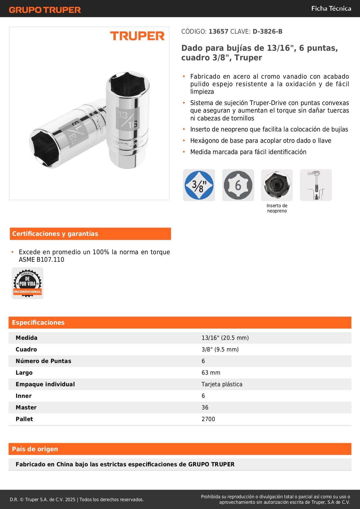 Dado hexagonal encastre 3/8'' para bujías de 13/16''. truper