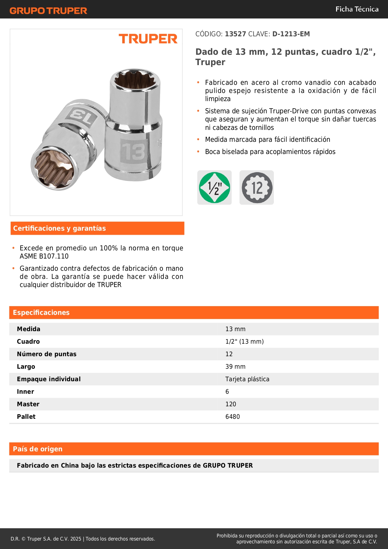 Dado poligonal encastre 1/2'' de 13 mm truper