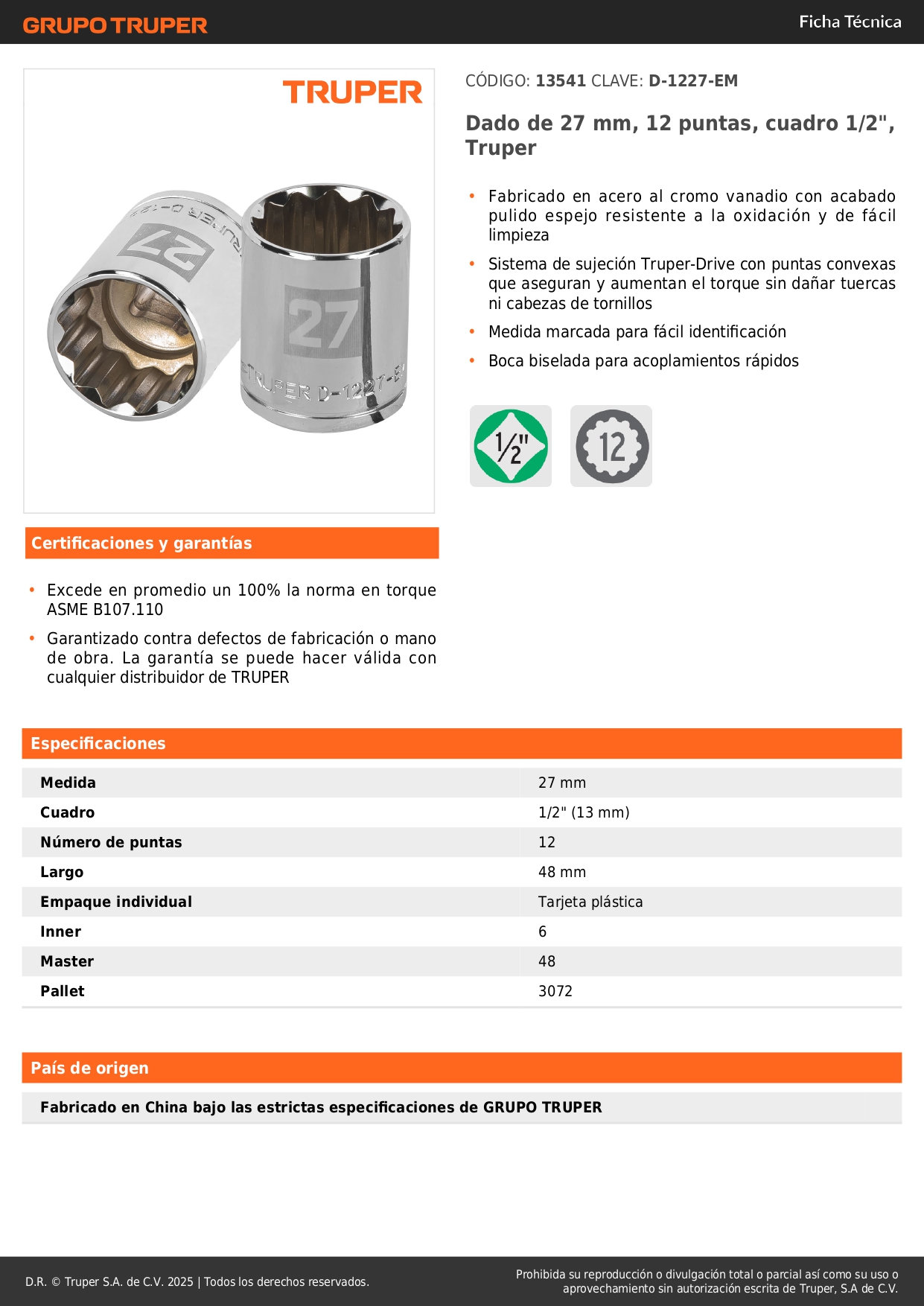 Dado poligonal encastre 1/2'' de 27 mm truper