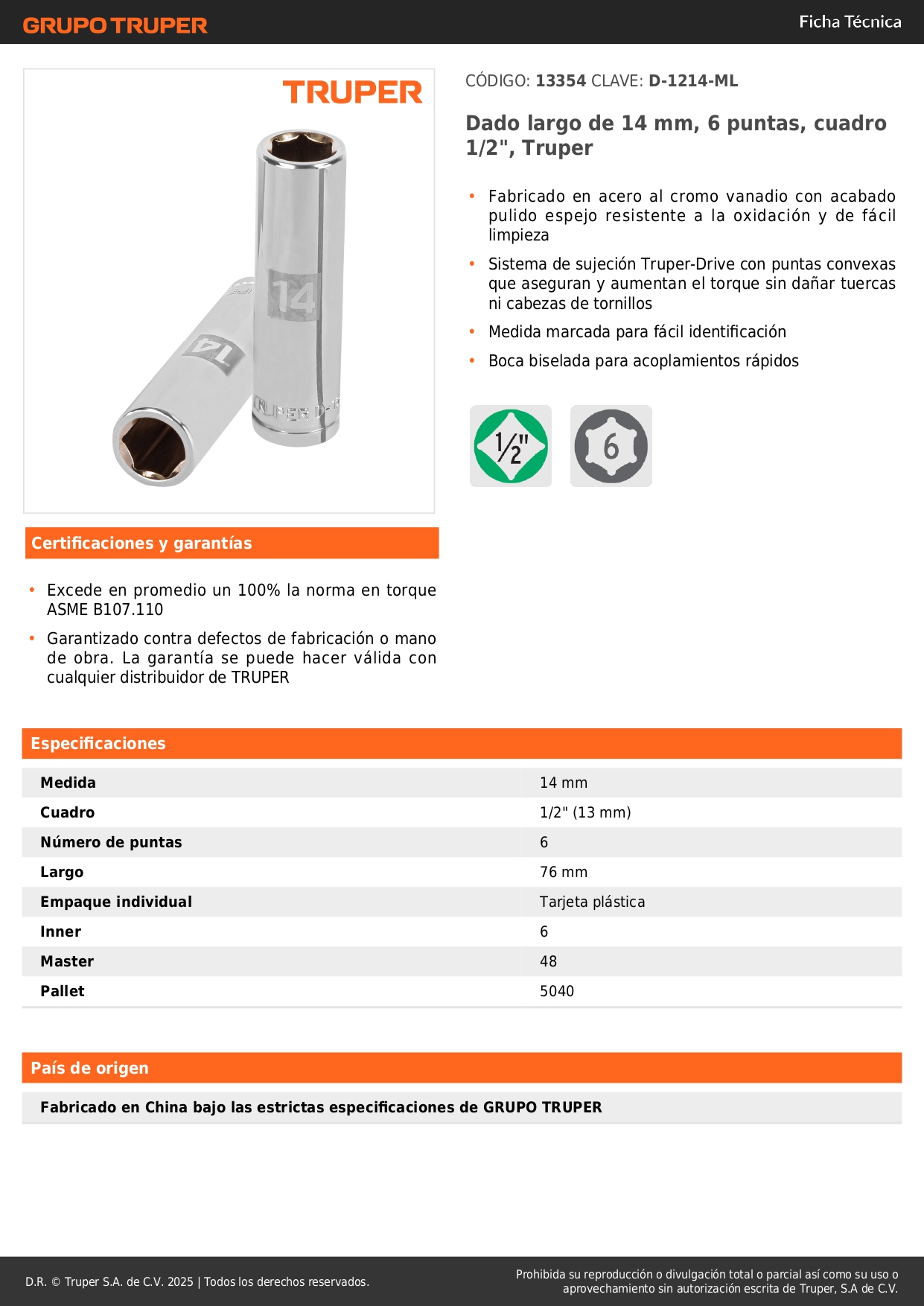 Dado tubular hexagonal encastre 1/2'' de 14 mm truper