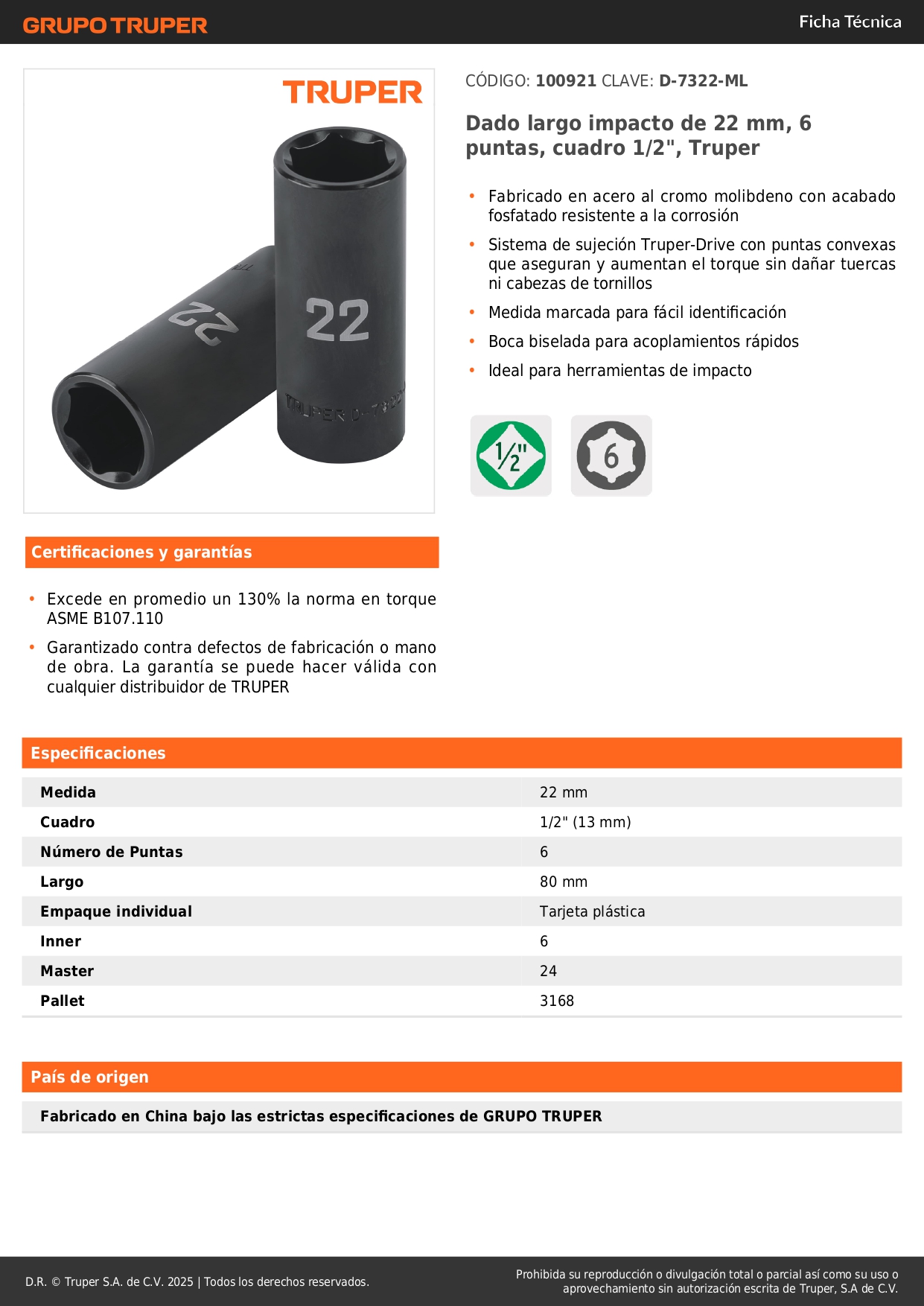 Dado tubular hexagonal encastre 1/2'' de impacto de 22 mm truper