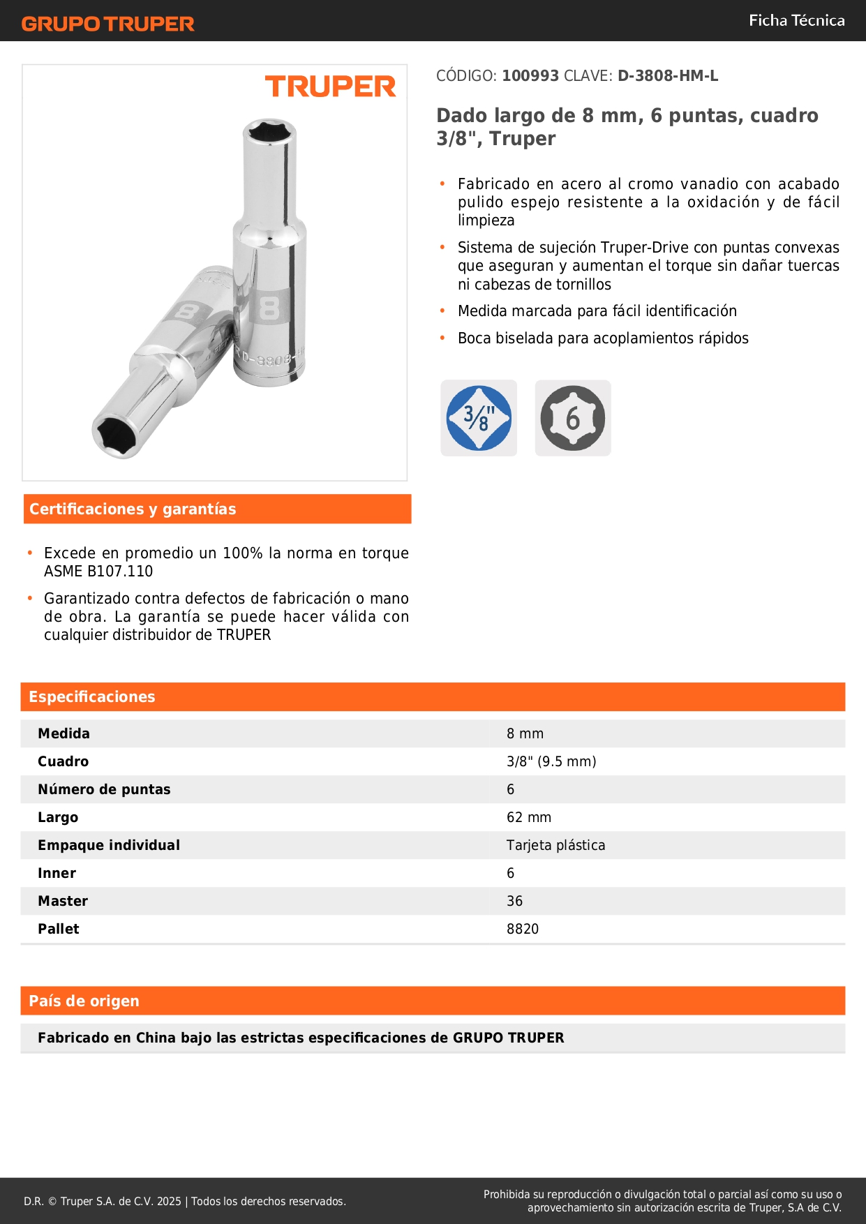 Dado tubular hexagonal encastre 3/8´´ de 8 mm, truper