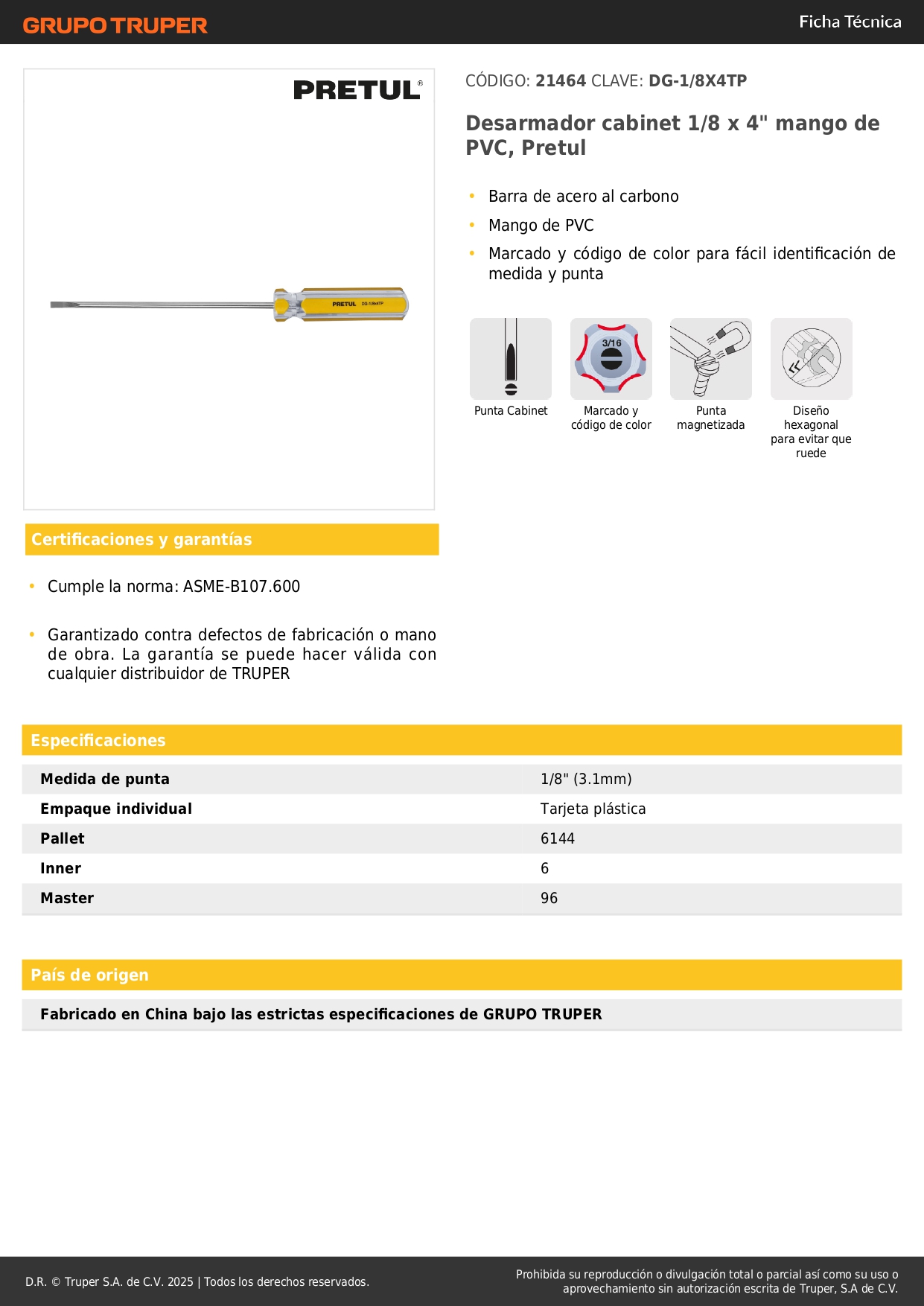 Desarmador cabinet 1/8 x 4´´ mango de pvc, pretul S/ 3.20 Agregar al carro Avísame cuando llegue -Barra de acero al carbono-Mango de PVC-Marcado y código de color para fácil identificación de medida y punta